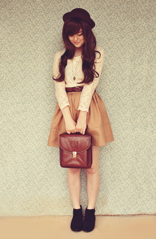 At the moment I love wearing different shades of browns together. It has a vintage-photography, antiquated feel to it. I matched this dark brown bowler hat from Oasap with a honey-coloured skirt and warm brown vintage satchel bag, and a beige lace shirt also from Oasap. Add my new Chelsea boots from Asos in the mix and I think this ended up being a pretty nice outfit. The only frustrating thing about today's outfit was that I took these photos in 35 degree heat - not so much fun - and when I finished, my memory card decided to die. So I had to retake all the photos and I think it's amazing I managed to not look totally grumpy in them all.