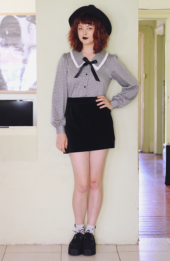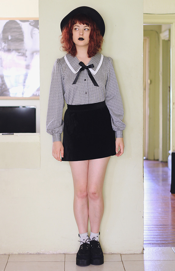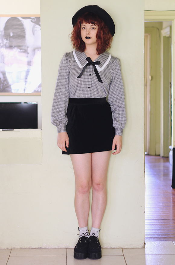 Shirt, skirt, hat and socks are all thrifted | Shoes are no longer for sale