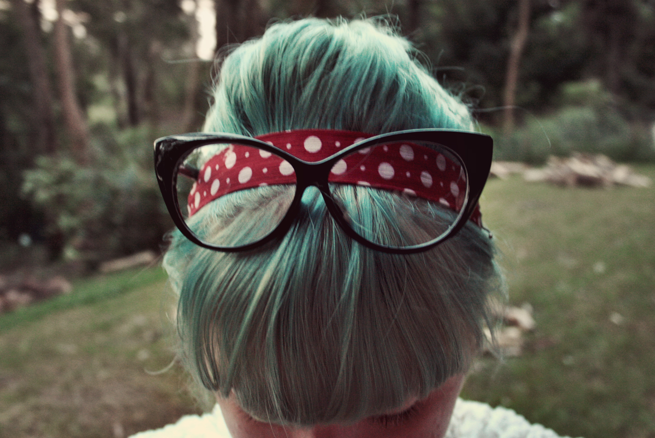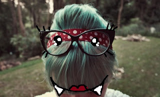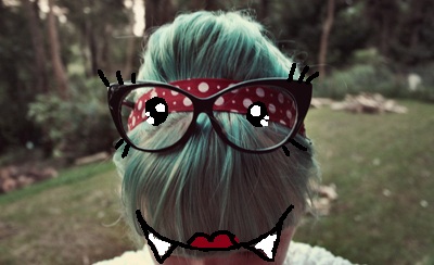 (When I was looking at this photo again, the perspective of the shot made it look (to me) like the glasses had taken on a life of their own, and my head of hair was a little cat-eyed blue monster. And it amused me a lot. So I made this.)