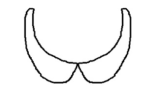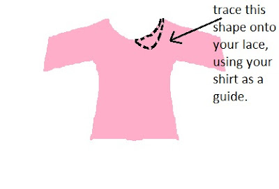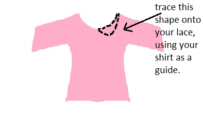 2. Draw onto the back of the lace with a fabric pen (a normal pen works just fine as well) the shape you think the collar should be. ONLY do one half of the collar (you will see why in a moment). Use the collar of the t-shirt as a guide for one edge of the lace collar, and judge for yourself what the other edge should look like/how big it should be. In any case, the shape you draw onto your lace should look something like this: