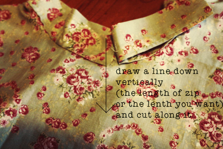 Now you will have a bit of overlap on the waistband. Where this overlap occurs, draw a line vertically downwards either the length of your zip (if you will be inserting a zipper), or the length you desire if you want to add buttons (you'll know when you've got the right length when you can fit it on over your hips!)