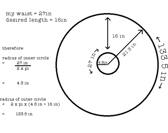 For example, here is what my measurements look like for my waist (27 in) and desired skirt length of 16 in.