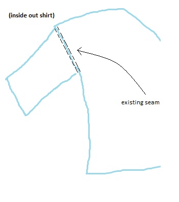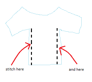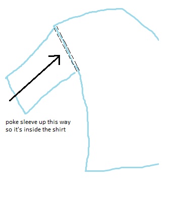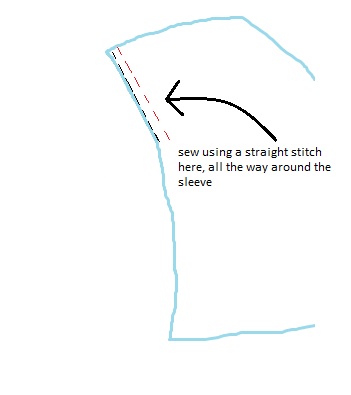 2. Where the sleeve meets the main body of the shirt, you should noticed that there is a sewn seam all the way around. Sew around this again using a long, straight stitch, but where you want to sew is 1-2cm (0.5 - 1 inches) in from the seam. (Try 1cm first, try it on, and if its still too big then you can go further.) And look at my diagrams because I explained that terribly.