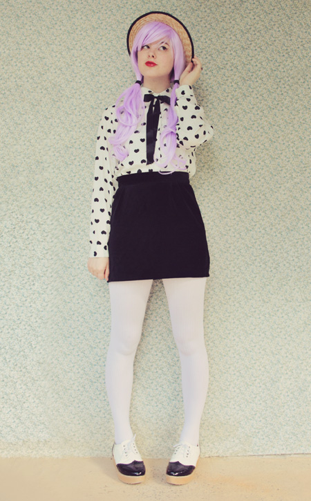 This is so wonderful! I love your heart print blouse with the velvet skirt. This is exactly the sort of thing I wish I could be wearing right now. It's just too hot to wear tights or long sleeves! You look so so cute!