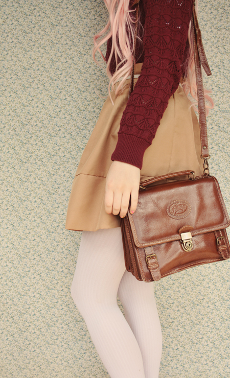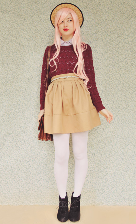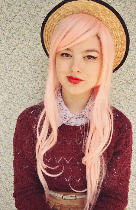 I love the pink wig! I've been thinking longingly about pink hair, but don't think I can commit to it, so perhaps a wig is in order? I also love how perfectly autumnal this outfit is. Your sweater is such a great color and I love it layered over the collared blouse.