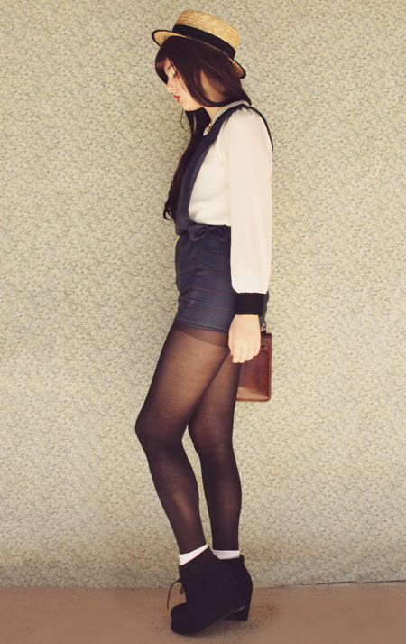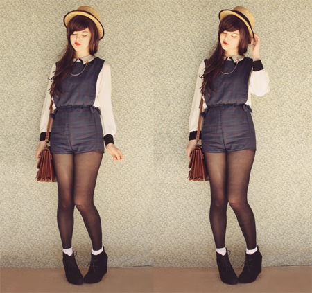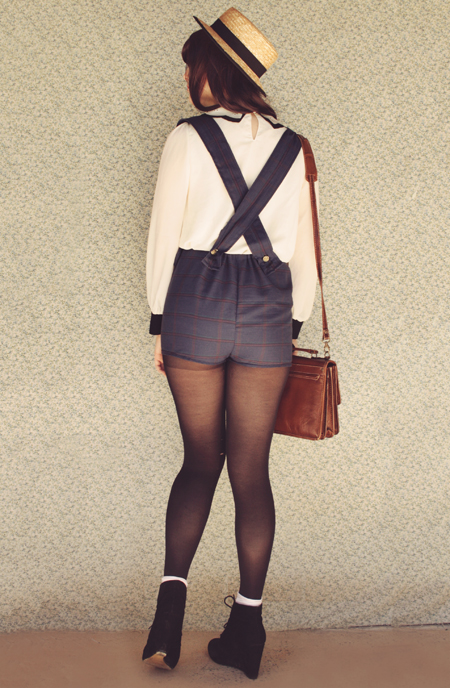This plaid, pinafore-style romper is probably my most favourite thing I've made! It's quite similar to my DIY overalls from a few posts back, except that the top part extends right up to my collar, and I added bows to either side of the shorts. I was inspired by this pinafore dress from Dahlia, which I pinned on Pinterest a few days ago (and if you follow my pinterest you'll always know what I'm going to be making really soon, haha).