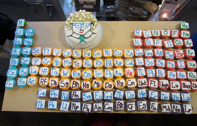 Okay, how awesome is this? Here's my nerd-love science item for the day. Brady Haran (from periodic videos) and the University of Nottingham chemistry department made a chemistry professor (who they obviously like quite a lot) a periodic table of cupcakes for his birthday: