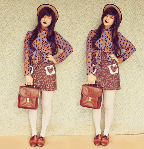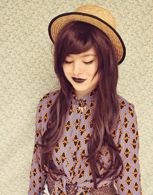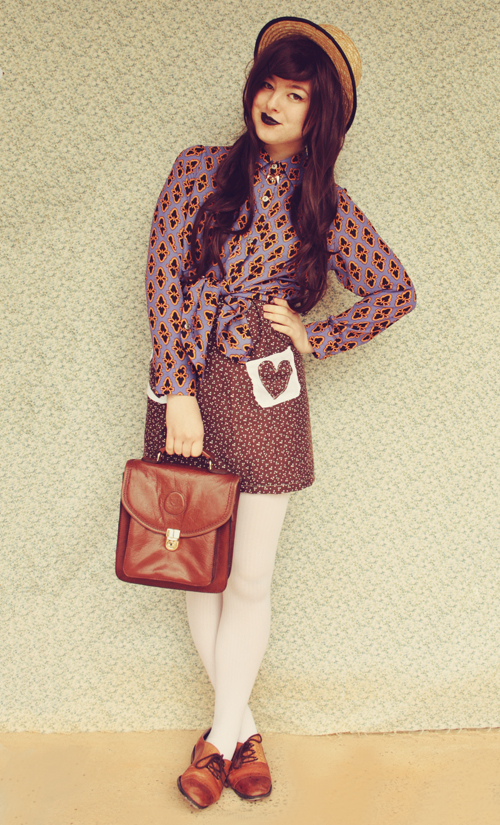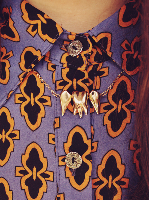 I made another skirt to go with my outfit today! I tried to attach the pockets so that they weren't straight to emphasise the handmade-ness of them, but now I'm kinda wishing that I did. Ah well. Learning process! How cool is this blouse anyway?? Paired up with the teeth necklace it's really kind of creepy!