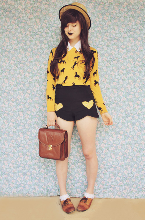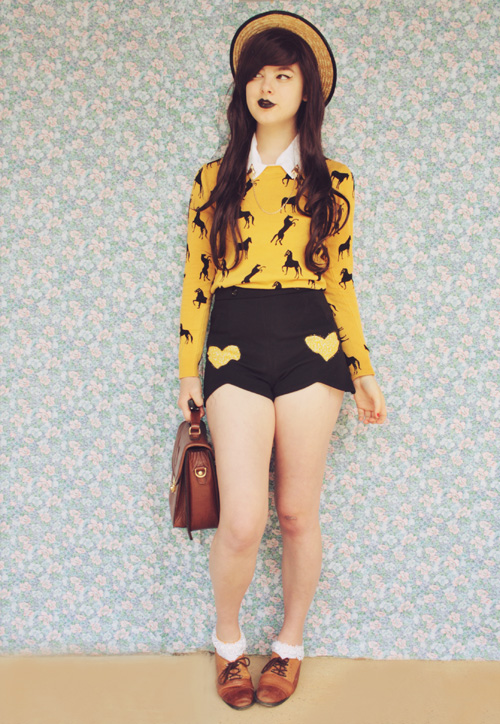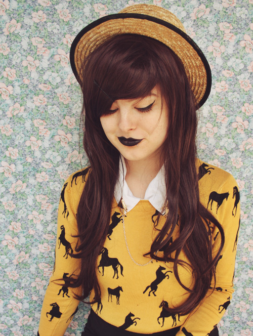 i adore the vampy shades of your hair and lips with the happy yellow. horses <3 ! haha way to go girl, always promoting our science :)
