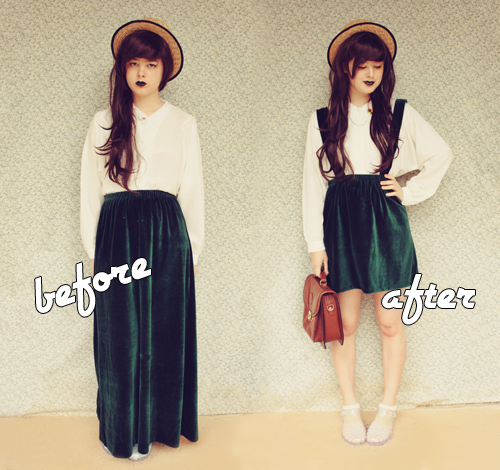 Unfortunately... I only took one photo of the skirt while it was long and didn't realise how grumpy I look in it until now. Oops. So... I guess you'll have to put up with my grumpy face. It kind of works in favour of the the before/after scenario, anyway.
