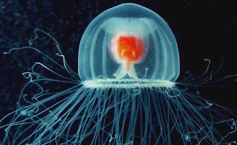 These jellies are the real-life equivalent of Benjamin Button - basically, once they reach old age, they can revert back to being babies again. This reversal process is part of their natural life-cycle and the fact that they can continuously do it again and again makes them biologically immortal. Read more here, they're amazing creatures.