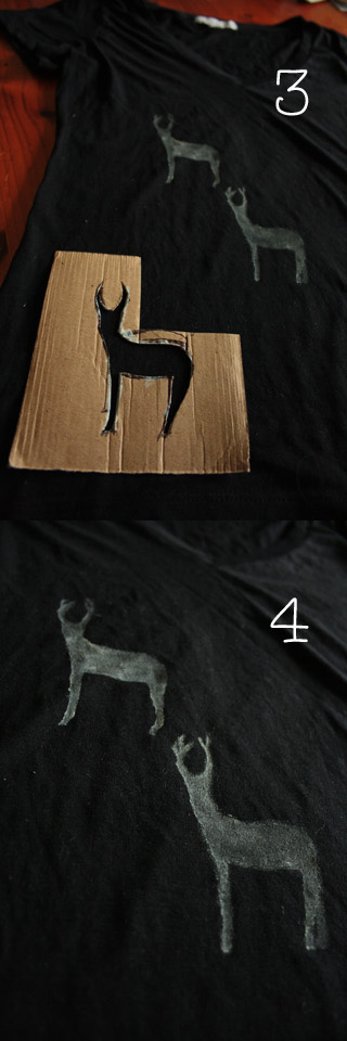 5. Paint your deers onto your shirt using the above images as a reference, or however you would like them to be arranged. When you flip the stencil over to do the ones facing backwards, make sure to clean your stencil with some tissue paper first!