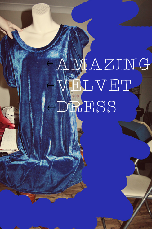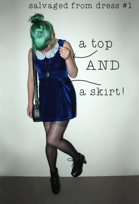 Take this puffy-sleeved, bright blue velvet number here, for instance: I actually ended up chopping it in half, and making it into both a tight-fitting blue velvet skirt, and a cropped peter-pan collar embellished singlet top. I'm just wearing both here at the same time! (And they work together as well, as a dress!)