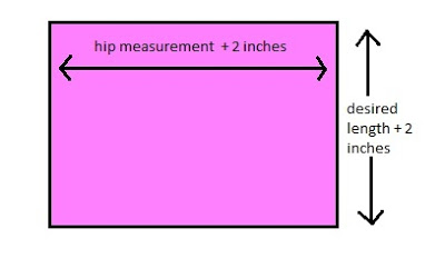 Next, cut your fabric into two identical rectangles, each measuring (your hip length plus 2 inches) x (desired skirt length plus 2 inches), ie: