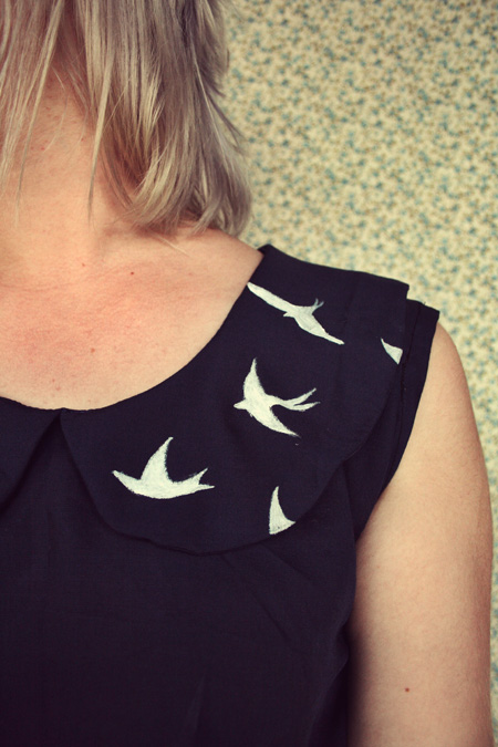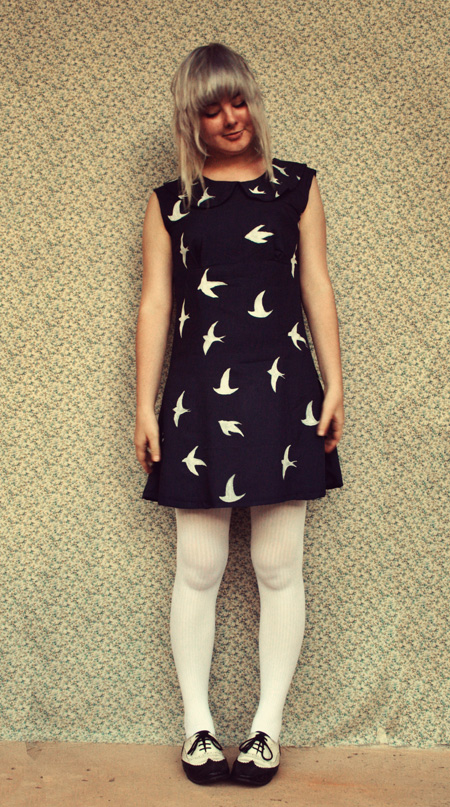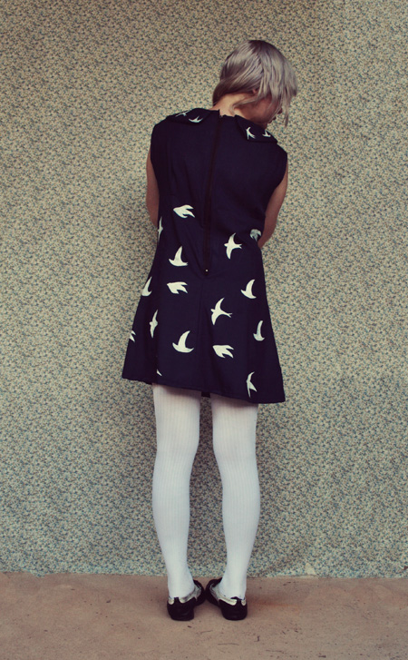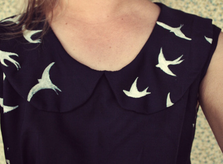 Okay, fellow bloggers and dear readers, I need your help. I made this navy peter-pan collar dress from this awesome vintage pattern I picked up while thrifting the other day (which only cost me 20c may I add!), and used $2 vintage fabric from the same store, and then hand painted it with little white birds. It turned out a little something like this: