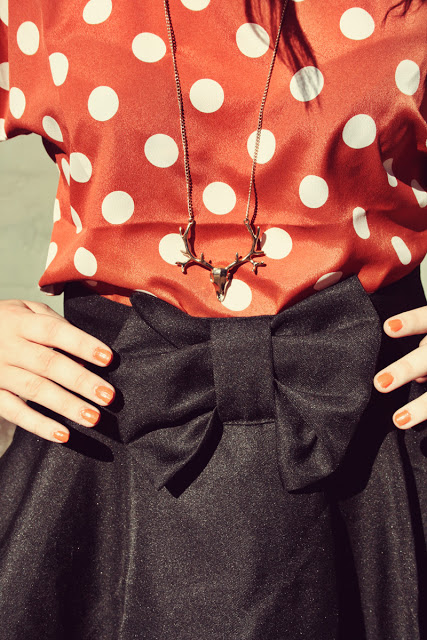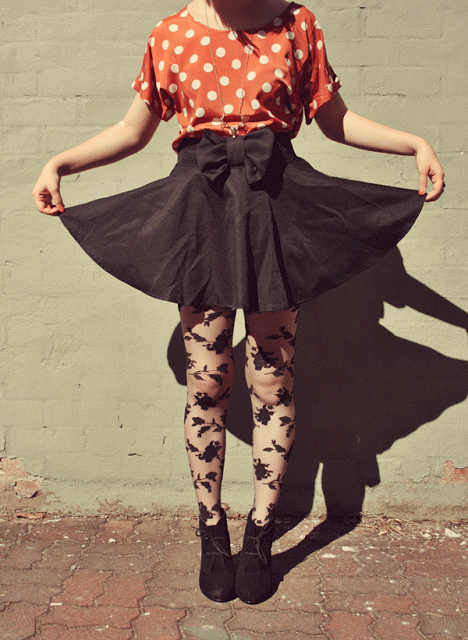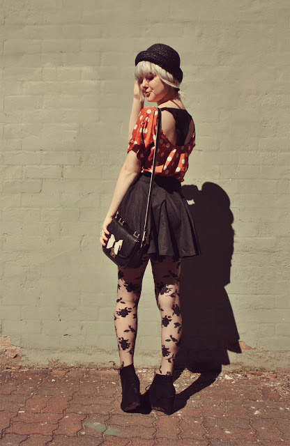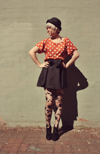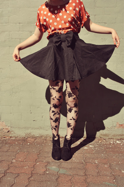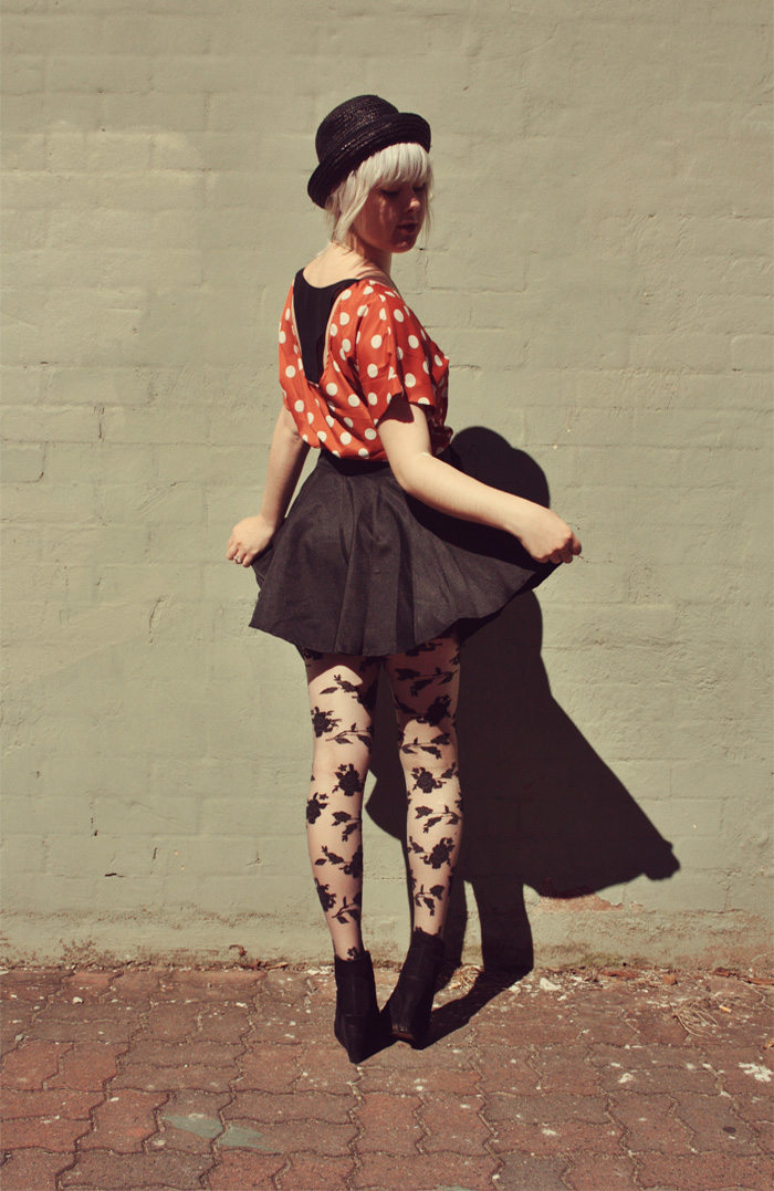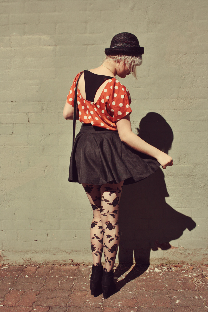 So this sweet clothing company from LA called Sugarlips Apparel were lovely enough to send me this amazing cut out back polka dot top, and I love it so! It goes amazingly with high-waisted skirts with a bit of “poof”, like the circle skirt I’m wearing in these photos. Because its so brightly coloured (& golly do I love bright things!), I toned it down a bit by pairing it with all black things, because I think I would have looked too insanely colourful otherwise.