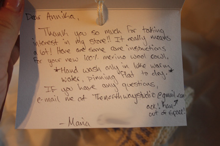 So, I have concluded that Etsy store owners are awesome. Maria is the nicest, friendliest girl (and a super talented knitter!), and the package was wrapped so nicely and came with the cutest card!