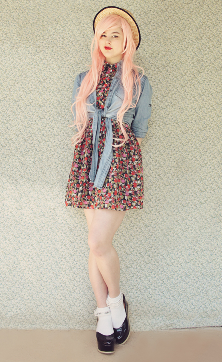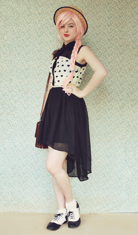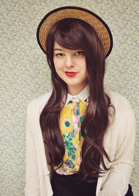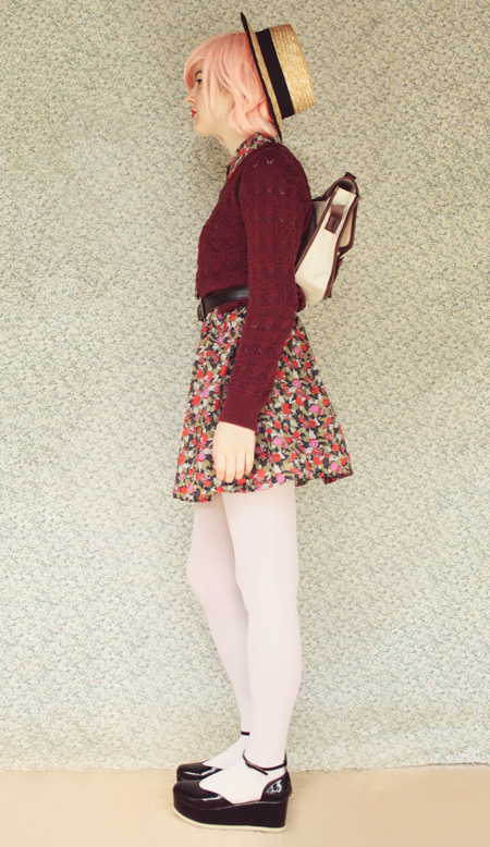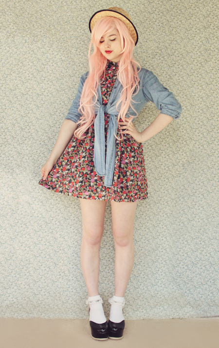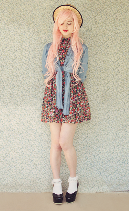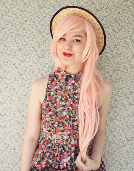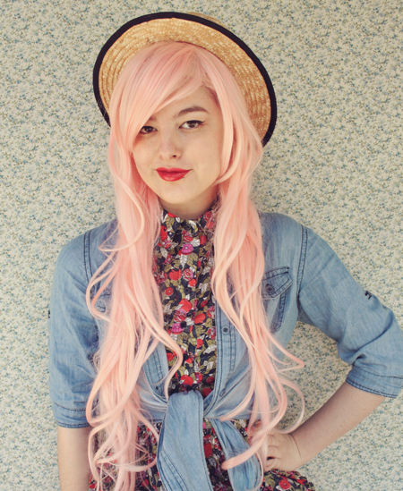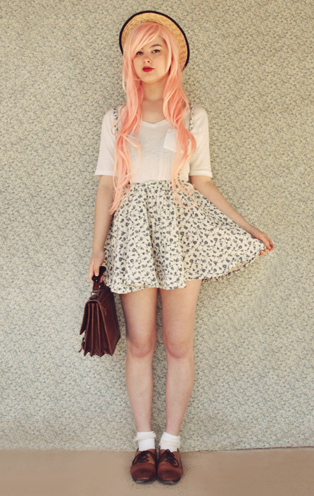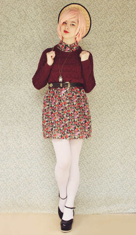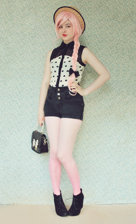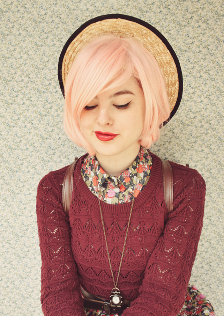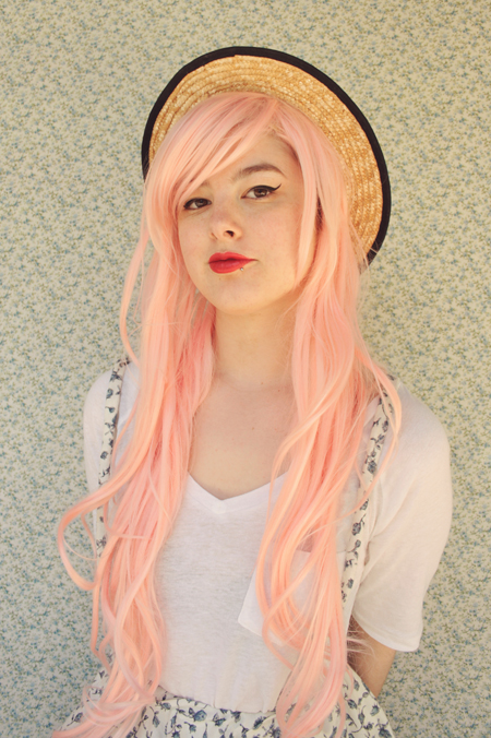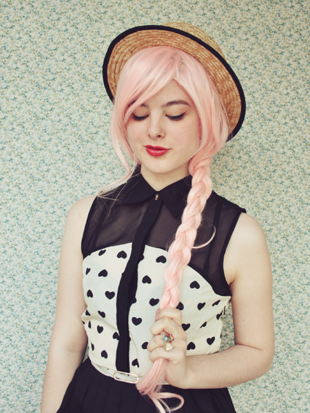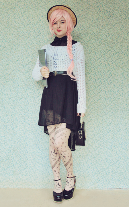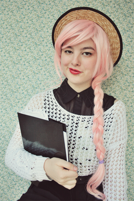 | (See part 1 here and 2 here.) Remix 1.3: I miss my pink bob :( I restyled my wig (ie, shoved it all up in my boater hat) to turn it into a wavy pink bob and had a wave of longing for my old hair. Maybe I'll just bleach it again... even though it's kind of falling out from overdying.. A cropped jumper and thick white tights turns this part 3 remix into a wintery outfit.