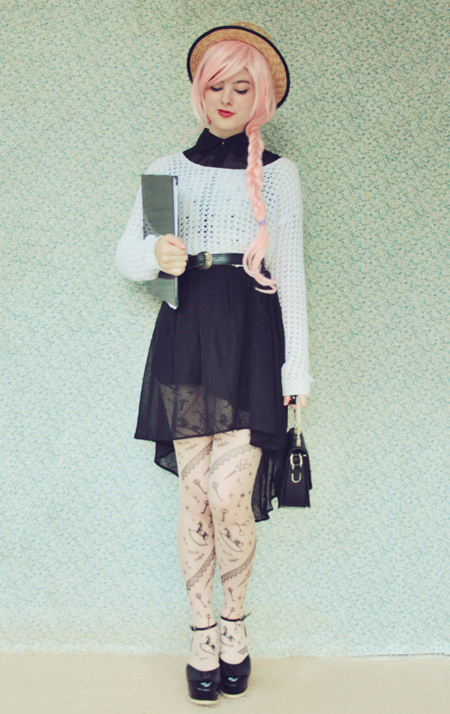 Remix 2.2: I threw a cropped crochet sweater on over the dress and donned these incredible tights from oasap. For authenticity, I am carrying a folder - and that's my real school folder as well, full of all my chemistry work from this semester, woo!