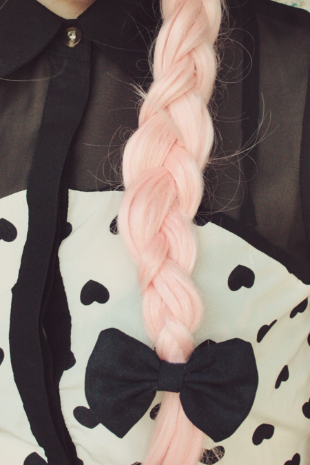 Remix 2.3: When you have a dress with such a lightweight chiffon skirt, it's really easy to hide it up in some high-waisted shorts and turn it into a cute little romper outfit. This is what I did for my third remix. I also threw on those gorgeous gradient tights to match my pink hair, and added a bow to my plait for some over-the-top near-pukeworthy kitchyness.