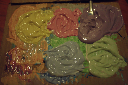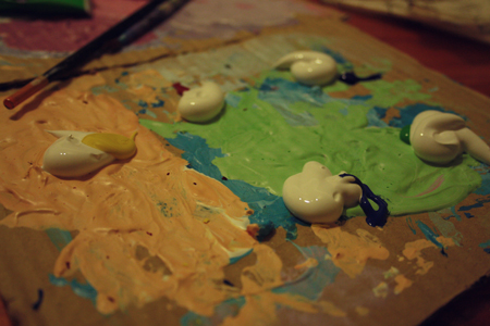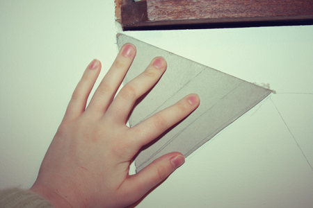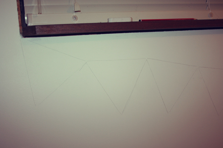1. Cut out a triangle from cardboard. This is going to be your stencil.2. Place the top left edge of your triangle right under the bottom corner of your window sill. Trace with lead pencil. 2. Trace triangles all along underneath your window sill until you reach the other end. Join all the triangles up like in the picture above (sorry it's really hard to see the pencil lines in this photo) 3. On a palette (ie... a bit of cardboard or equivalent), place a teeny amount of a few different colours. I used yellow, blue, red (to make pink), green and red + blue (to make purple). Then add a much larger quantity of white paint to the colour. This is how you will make your pretty pastel colours! Of course, if you already have pastel paint then feel free to use that. 4. Mix the colour with the white... and you now have a few pretty pastel colours.