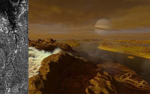 Astronomers recently took this picture (the one of the left) of the surface of Titan and have deduced that it is very likely a river. Titan is one of Saturn's moons and likely the most habitable body in our solar system after Earth, and the only other world we know of with stable liquid on its surface. The scientists don't think the river is water however, more likely liquid ethane or methane. Still, it's pretty exciting to imagine an alien world with a running river and possibly even oceans.