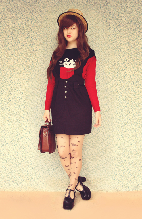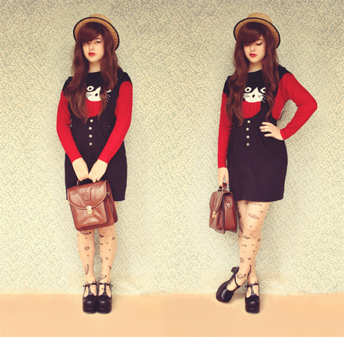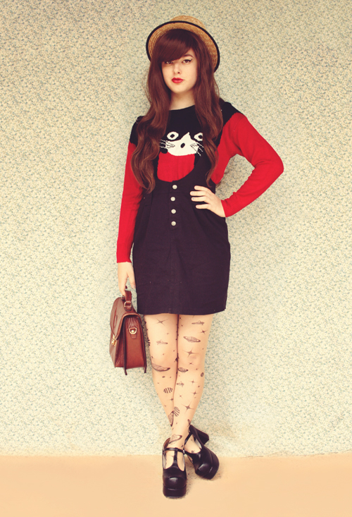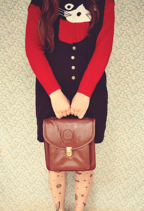 this is such a great pairing! I love the cat sweater with that pinafore skirt and the tights are crazy cool.