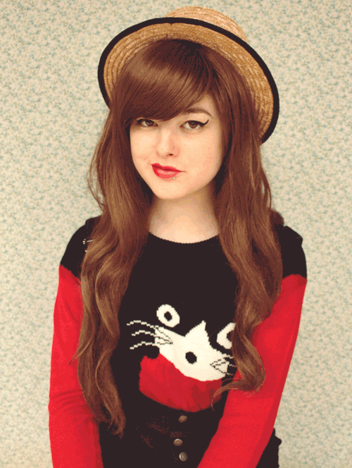 Even though this sweater was on the list of items I'm packing for Japan, I couldn't resist wearing it the other day when it suddenly became inexplicably freezing. I was in the mood for a bizarre kind of outfit, so the effect of a kitty being draped over my shoulders went well with the planet stockings. Again, I'm wearing my amazing new t-bar platform shoes from Topb2c which I've been (somewhat impractically) living in for the past few days.