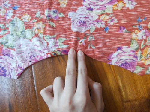 1. Lay your fabric flat on your surface. Lay the shirt on top of it. 4. Make sure the top is inside out! Hem the neckline on each piece separately by rolling and folding in the fabric. Pin & sew.
