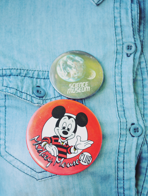 My friend Hannah gave me these badges that she thrifted the other day. Aren't they sweet? I LOVE the science museum one, and they go super well with this denim tie-shirt.