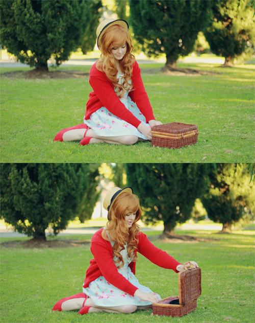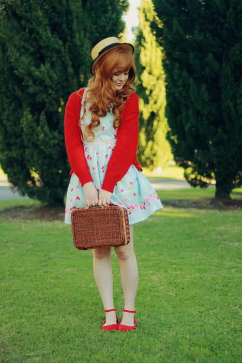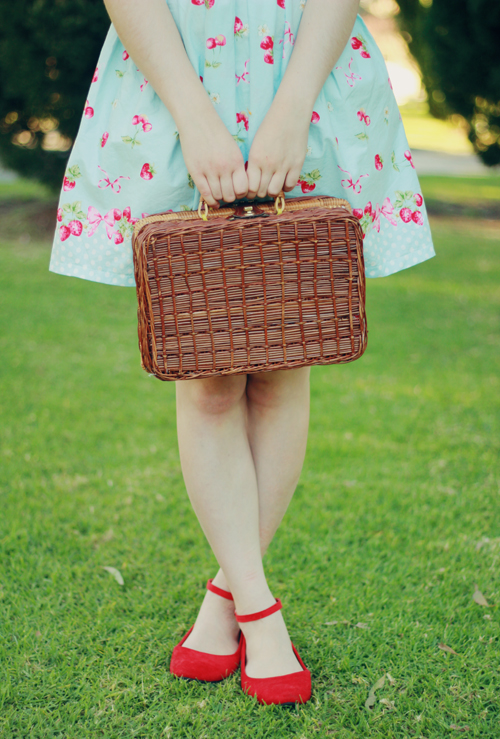 This dress has the cutest scalloped design on the front of it, don't you think? I thought that it was definitely the right dress to take on a "picnic" (I didn't go on an actual picnic because I'm doing 20 hours a week in the lab right now and have no time for such luxuries :( but it was a picnic-themed shoot nonetheless). I am planning on turning this picnic basket into a handbag at some point! I think I'll attach a pretty strap so that I can wear it as a shoulder bag.