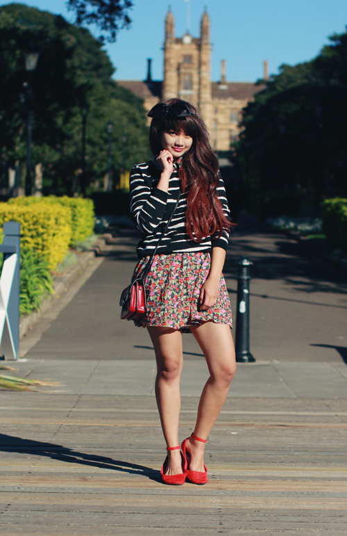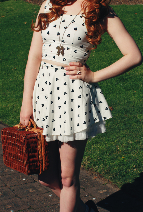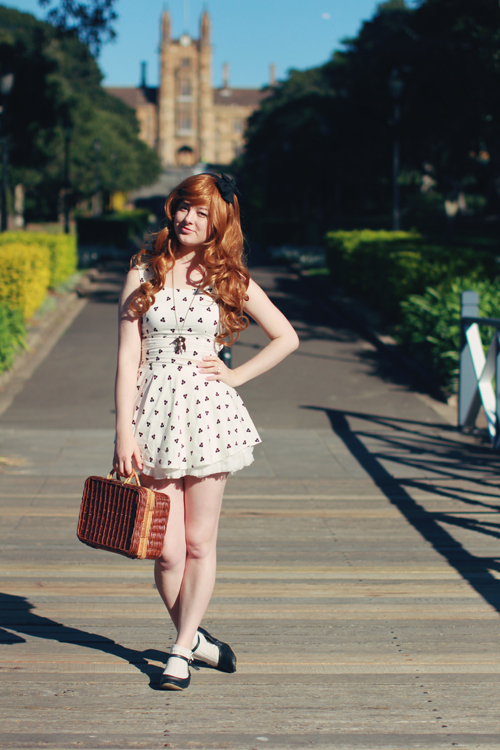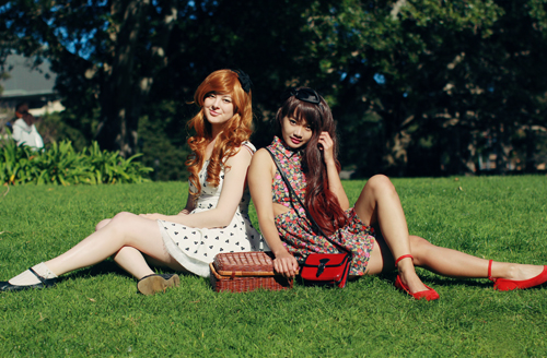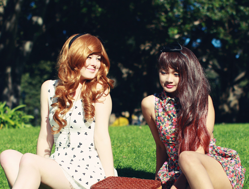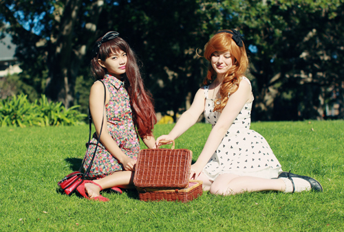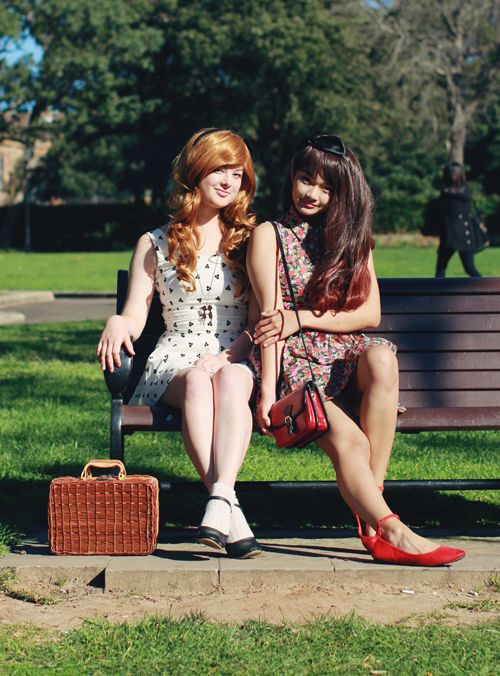 Ashley is my sister from another mister. We coordinated our outfits unintentionally, but looking back through these photos, I realise how alike we appear! It's probably got a lot to do with the fact that we're both wearing wigs and teeny dresses. Or maybe it's because Ashley is wearing my clothes. For this outfit post, we went on a little pretend picnic in Victoria park outside of Sydney University, after getting up super early (like 7am, haha) to make sure the light wasn't too intense for our photos! I love that I have finally found someone else who will happily sacrifice sleep, comfort and shoot for hours on end just to get the perfect photo. I am going to miss this girl!