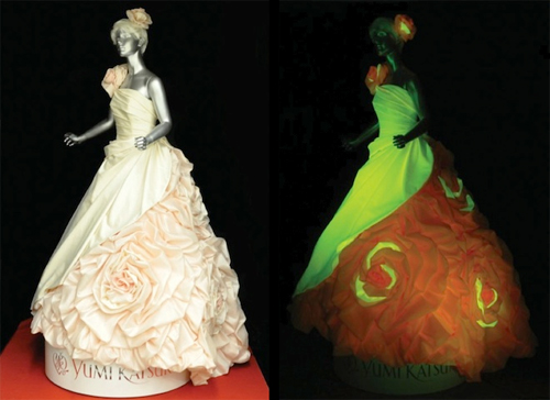 This dress was made out of silk from transgenic silkworms, who can produce glowing silk.