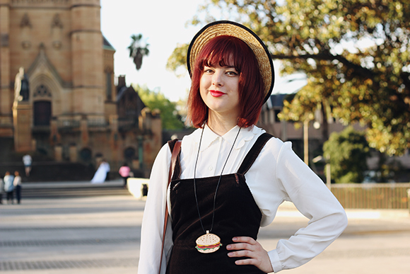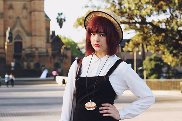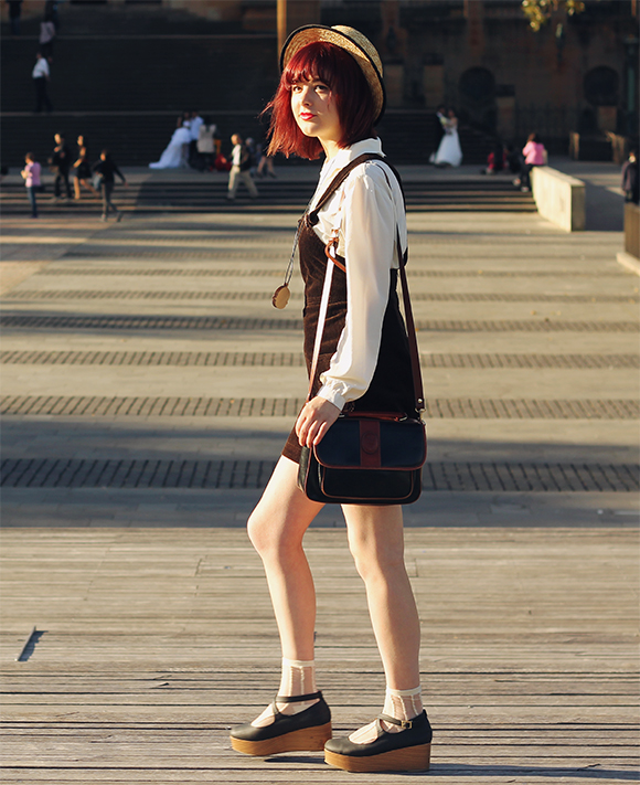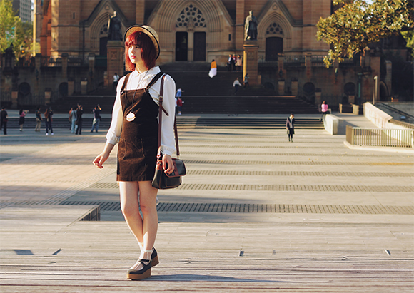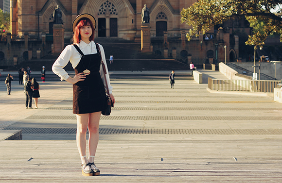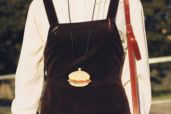 Pinafore and shirt are thrifted, socks are from Tutuanna, necklace is from Clear It and shoes are from Japan.