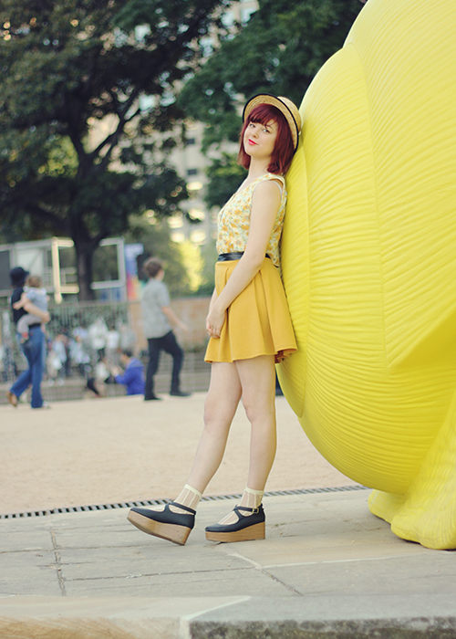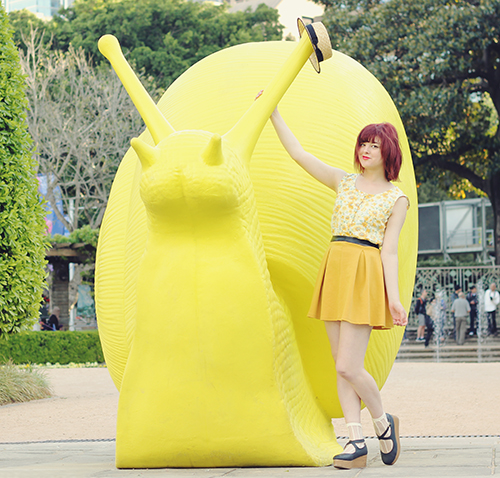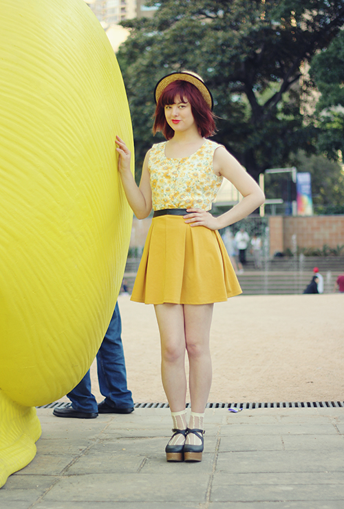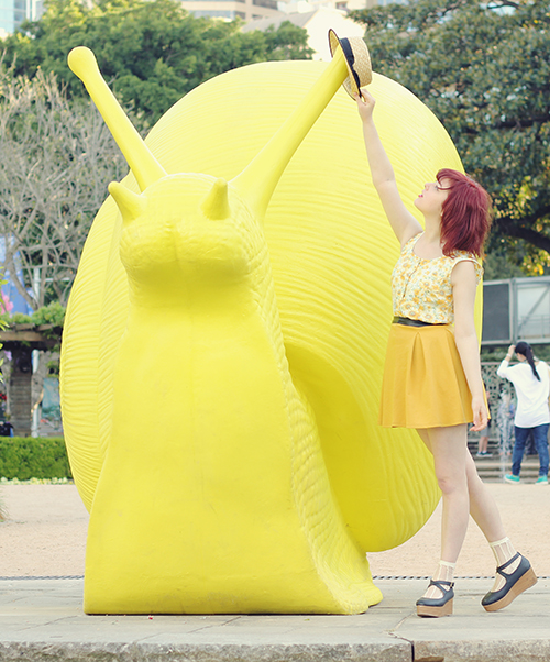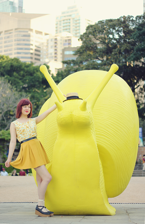 Photos are by Ana Andrés. Sometimes, Sydney can be pretty cool. These snails have been popping up all around the city as part of an art project, and while I was taking photos with Ana Andrés the other day we decided they'd be a good prop for one of my outfits! I made this top from a frumpy floral dress that I got from a second hand store in Japan - I couldn't go past the sunflower fabric. In fact, I made it into both a cropped top and a skirt, and it's much more flattering than it was in its previous form! I'm really getting into making my own clothes again - now I've stopped constantly buying new things, it's really forced me to start tackling my pile of "to do" clothing! I was hoping that some kind of giant snail like the one above actually existed (or had existed, though all I could find when looking up giant snail fossils was places to buy them...). However, the actual largest living snail in the world is called the Australian trumpet snail (and I'll let you google them yourselves if you want to see pictures of them, because they're pretty freaky and I learnt my lesson after people freaked about me posting about underwater spiders). Here's a picture of a shell which once contained a trumpet snail, so you can imagine how huge they are. Anyway, these snails can weigh up to 18kg, and be almost one metre long. Apparently they live in Australia - though I've never seen one haha! They exist right up at the top of Australia, in the oceans (they are in fact a sea snail), and also live in some parts of Indonesia and Papua New Guinea. These snails are actually about the same size as the pet snails in Spongebob, so now I can't help but imagine that they all look like Gary.