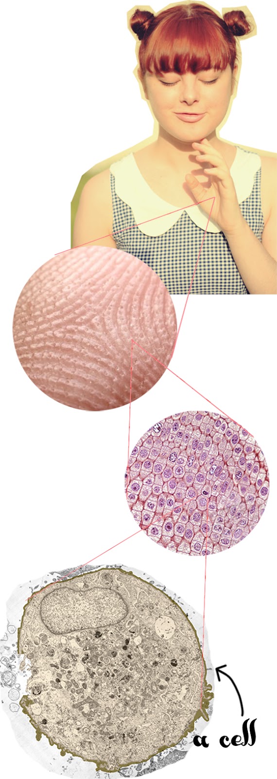 Now, let's talk genetics! Genetics and the basics of biochemistry take a long time to wrap your head around. Much of my love of science comes from actually understanding how things work. When you read science stories, you might be like, "yay! researchers discovered the gene for disease x!" and "scientists found that too much protein y makes you develop disease z!", and while that's awesome, without a background in molecular biology, you may also be like "...okay, but what does that actually mean?" What the heck even are cells, DNA, genes, chromosomes and proteins? So what I'm going to do in the next few posts is attempt to explain what these terms mean. I'm assuming no prior knowledge of anything biology-related. Today I'm going to explain cells, chromosomes and DNA. Let's go! Your body is actually composed of units called "cells". Cells are little water-filled sacks that contain useful things needed to sustain life, including DNA. Take a look at your skin. If you could zoom right in on a single cell, using microscopic eyes, you would see something like this: