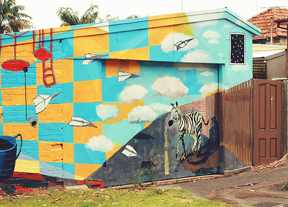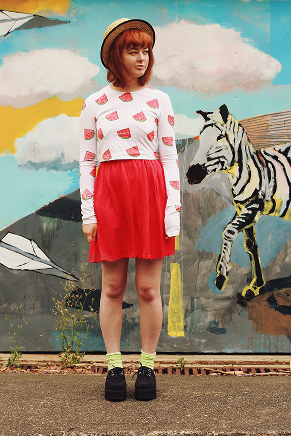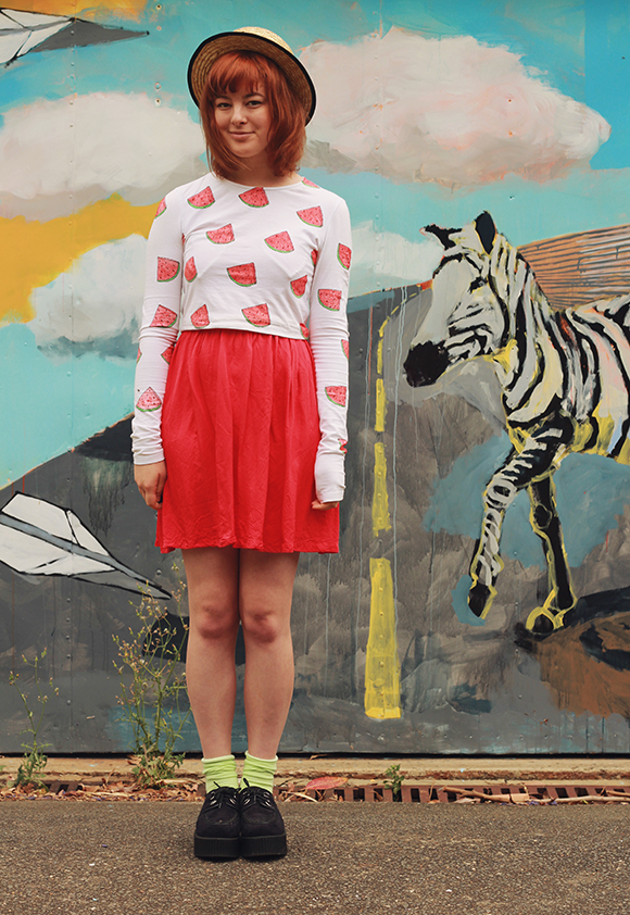 This is probably the best photo-taking wall I've found since I moved to Sydney last April. One of my favourite things while out and exploring our neighborhood is coming across bizarre public murals such as this one. As for my outfit, after putting on this shirt I decided to just go the whole way and embody a watermelon by pairing it with a red skirt and green socks.