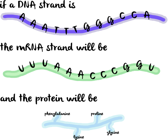 around in your cell, a code waiting to be translated into the language of amino acids. When it is translated into a series of amino acids, this is called a protein. The protein can then go and do useful stuff - like making your hair a particular colour.