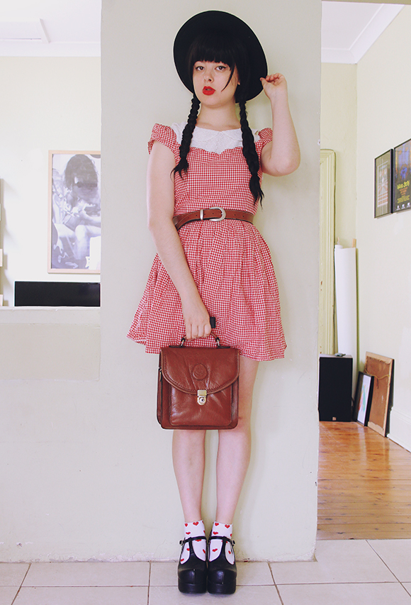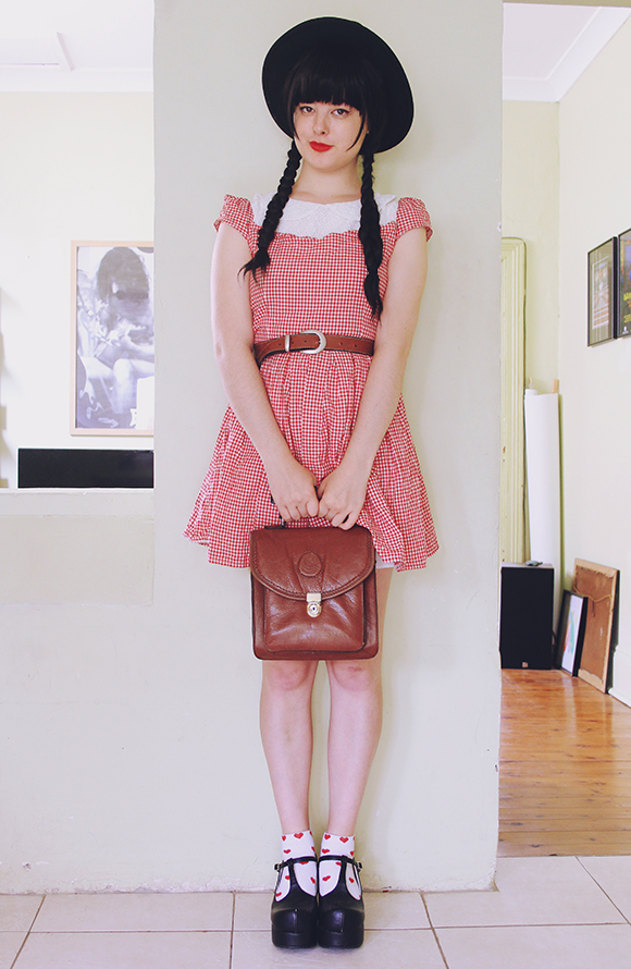 Dress is from Bonne Chance | belt, bag and hat are thrifted | shoes no longer for sale | socks from markets
