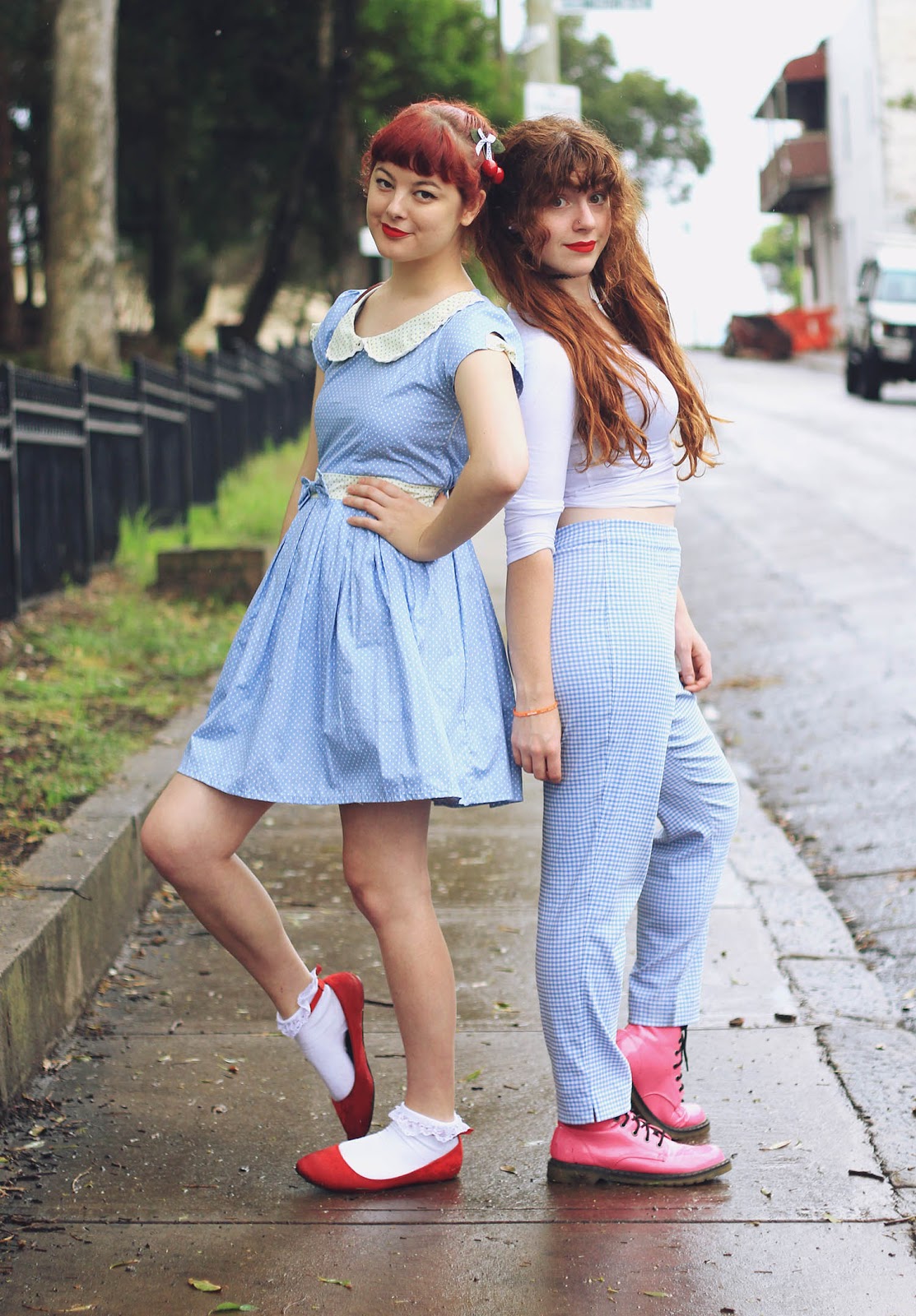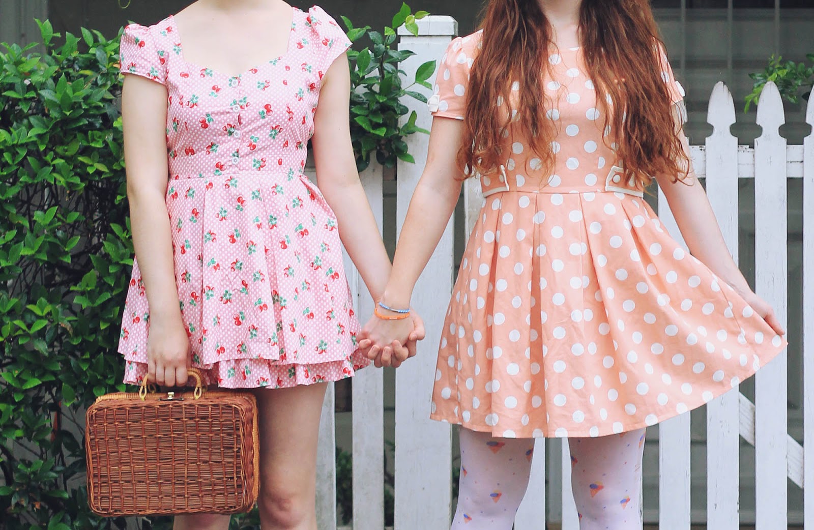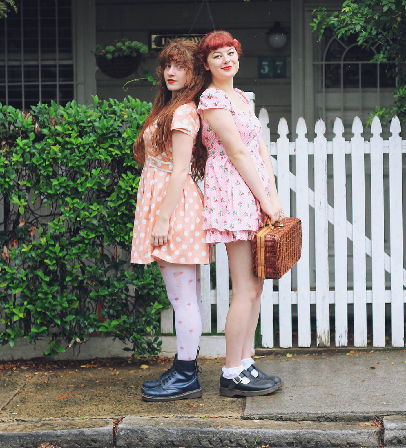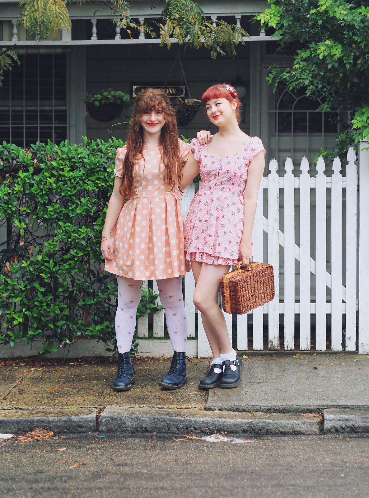 Dresses are both from Bonne Chance | Cherries c/o Sarsparilly | shoes are thrifted | picnic basket is thrifted | socks are from a market stall | Lime Crime Velvetines (red velvet) on our lips