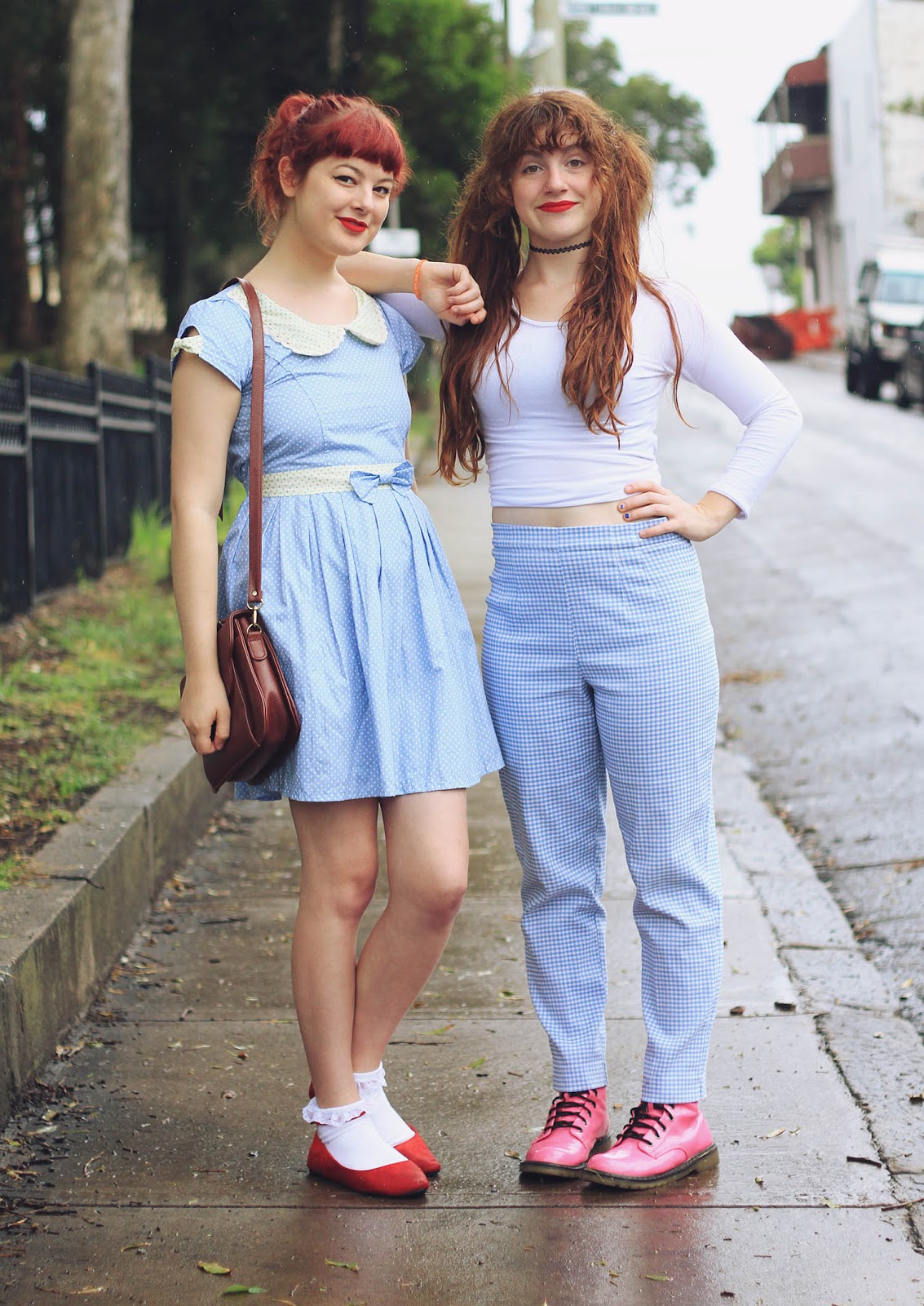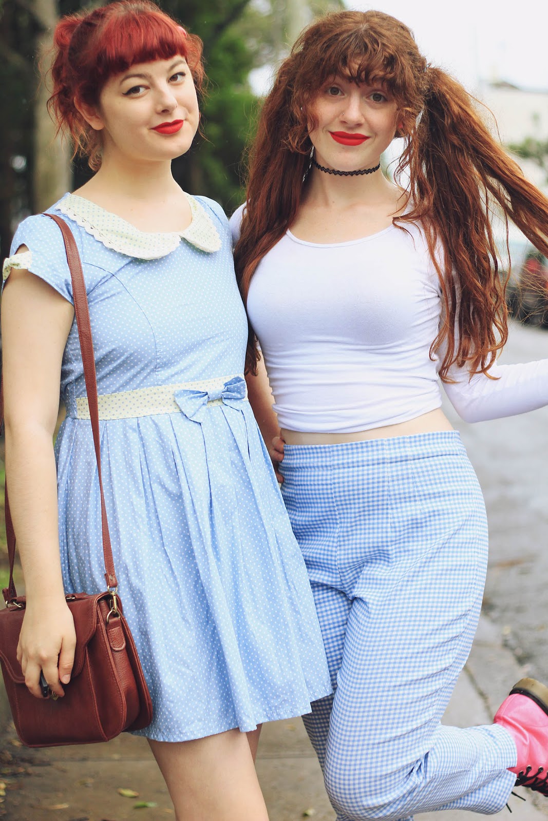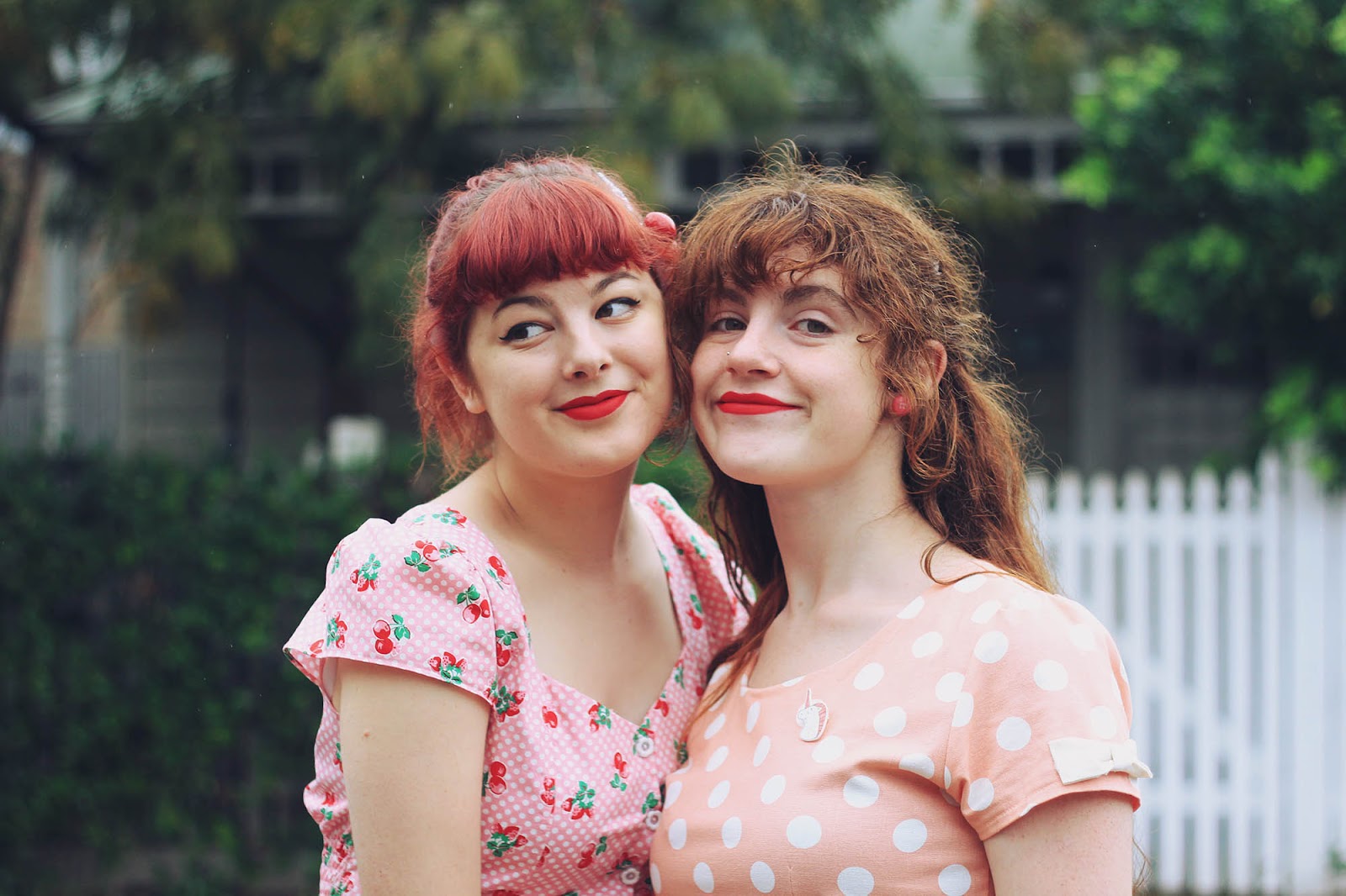 Dresses are both from Bonne Chance | Cherries c/o Sarsparilly | shoes are thrifted | picnic basket is thrifted | socks are from a market stall | Lime Crime Velvetines (red velvet) on our lips