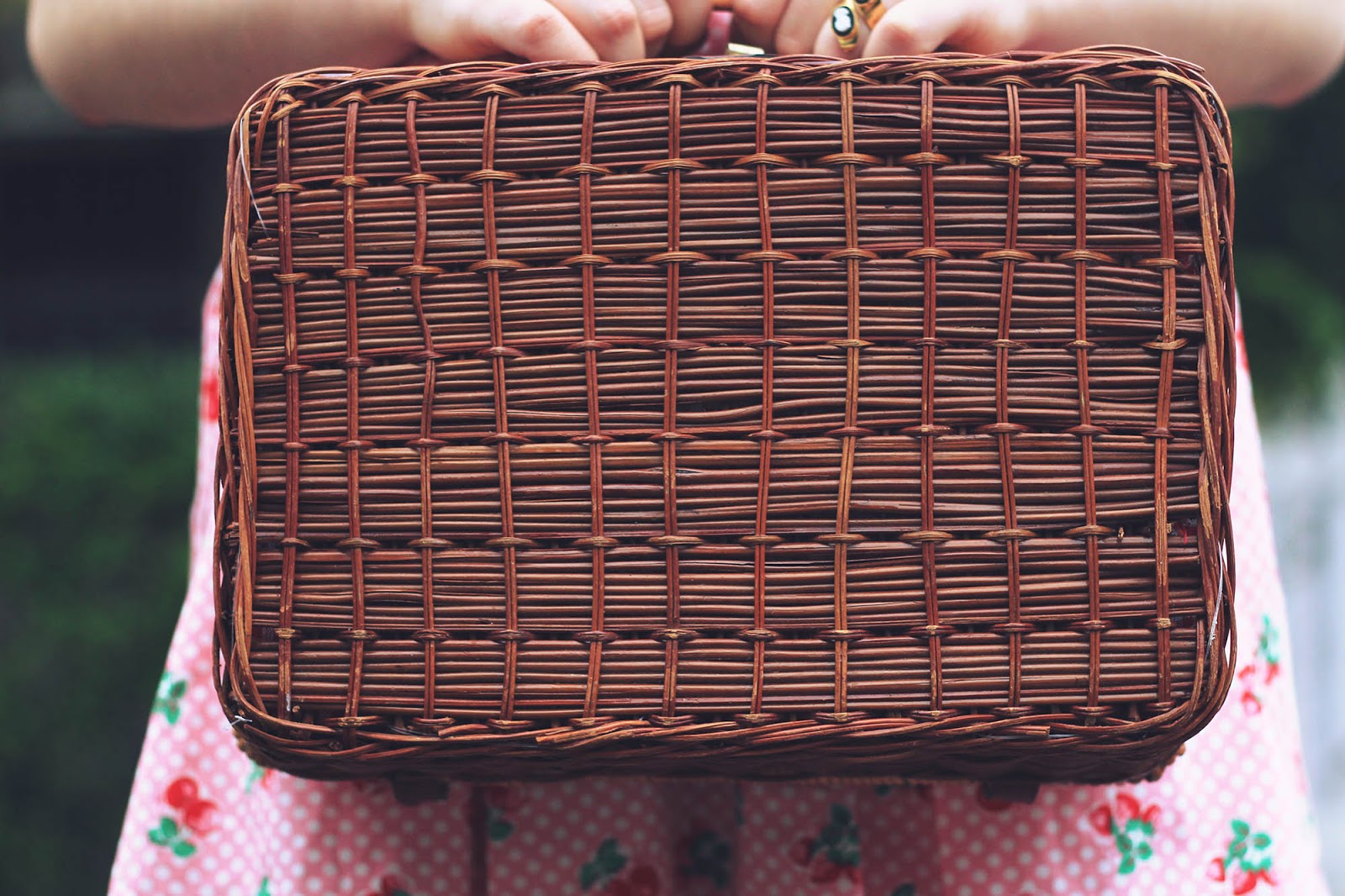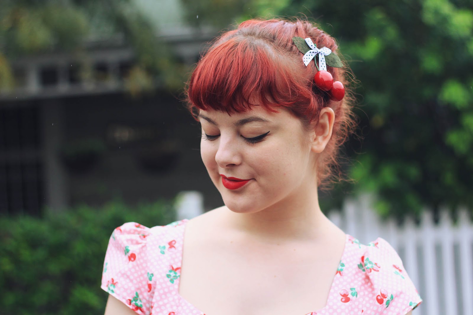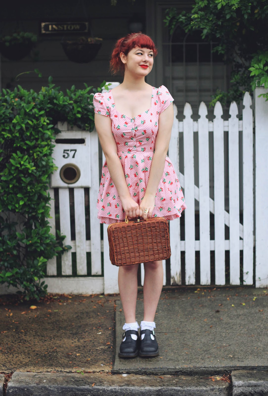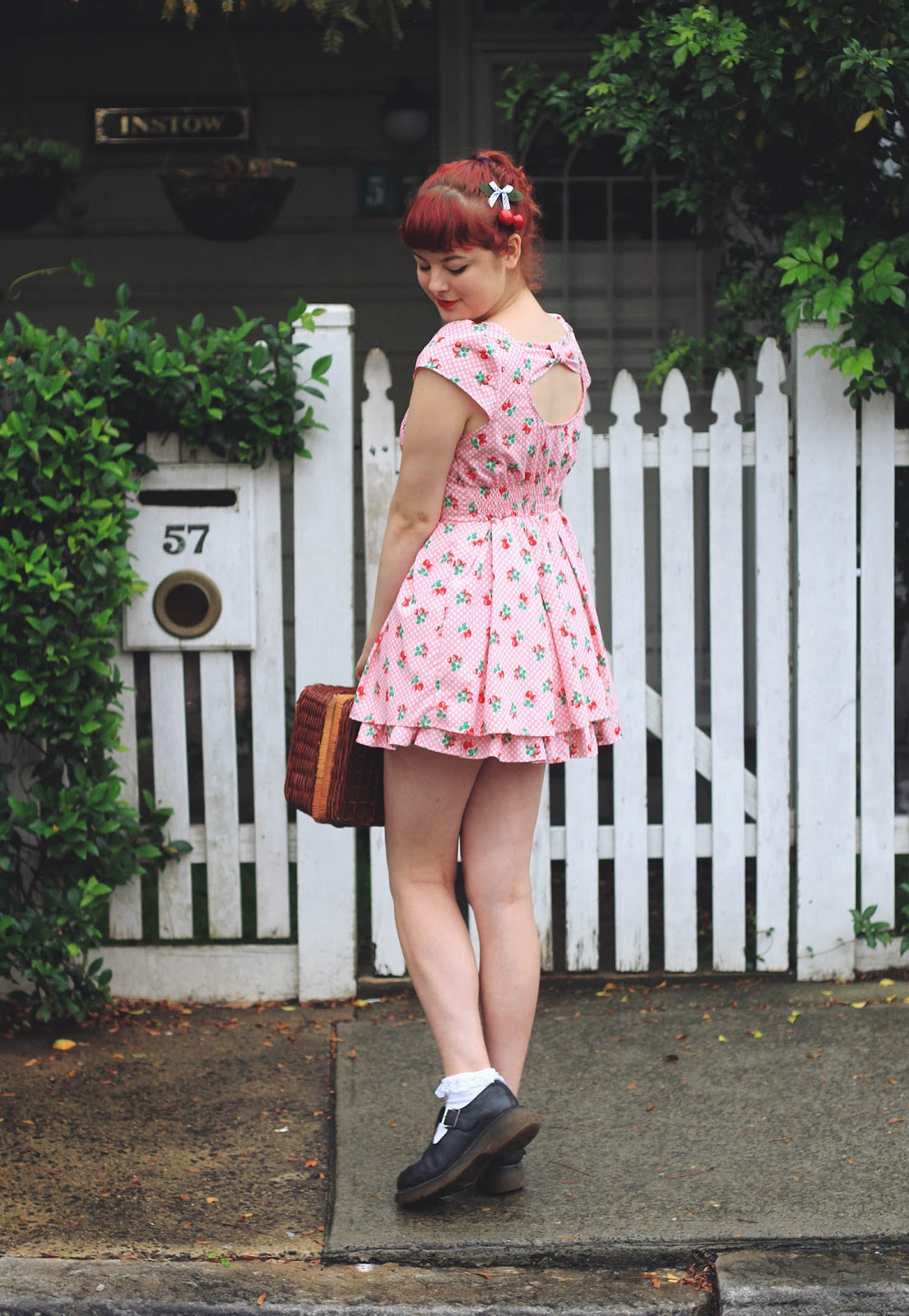 Dresses are both from Bonne Chance | Cherries c/o Sarsparilly | shoes are thrifted | picnic basket is thrifted | socks are from a market stall | Lime Crime Velvetines (red velvet) on our lips