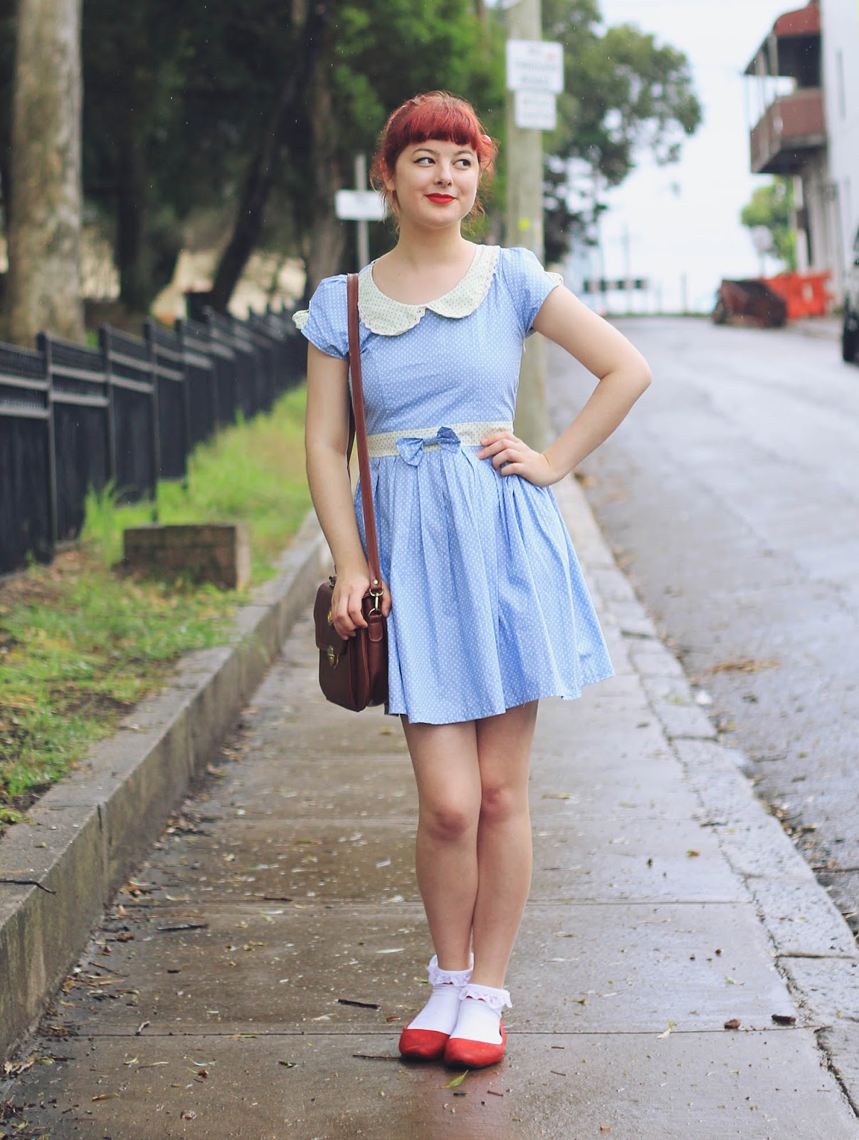 Dress is from Bonne Chance | bag is thrifted | socks from a market | shoes from Yeswalker | hair clip c/o Sarsparilly