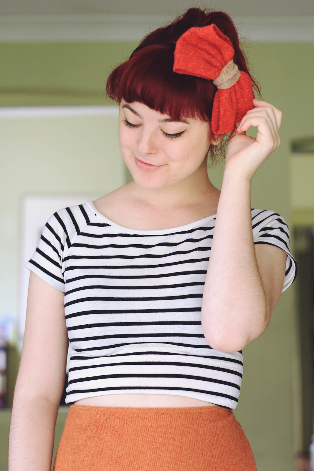 I am pretty dang proud of myself right now, because I figured out how to make a tight-fitting crop top out of a loose, long-sleeved shirt! It's the one I'm wearing right now :D And I think that I'll upload a DIY on it very soon - I've got plans to do this to many of my cute-but-a-bit-too-big t-shirts! For good measure, I also made the sleeves into a matching pair of socks (which I have a DIY for here).