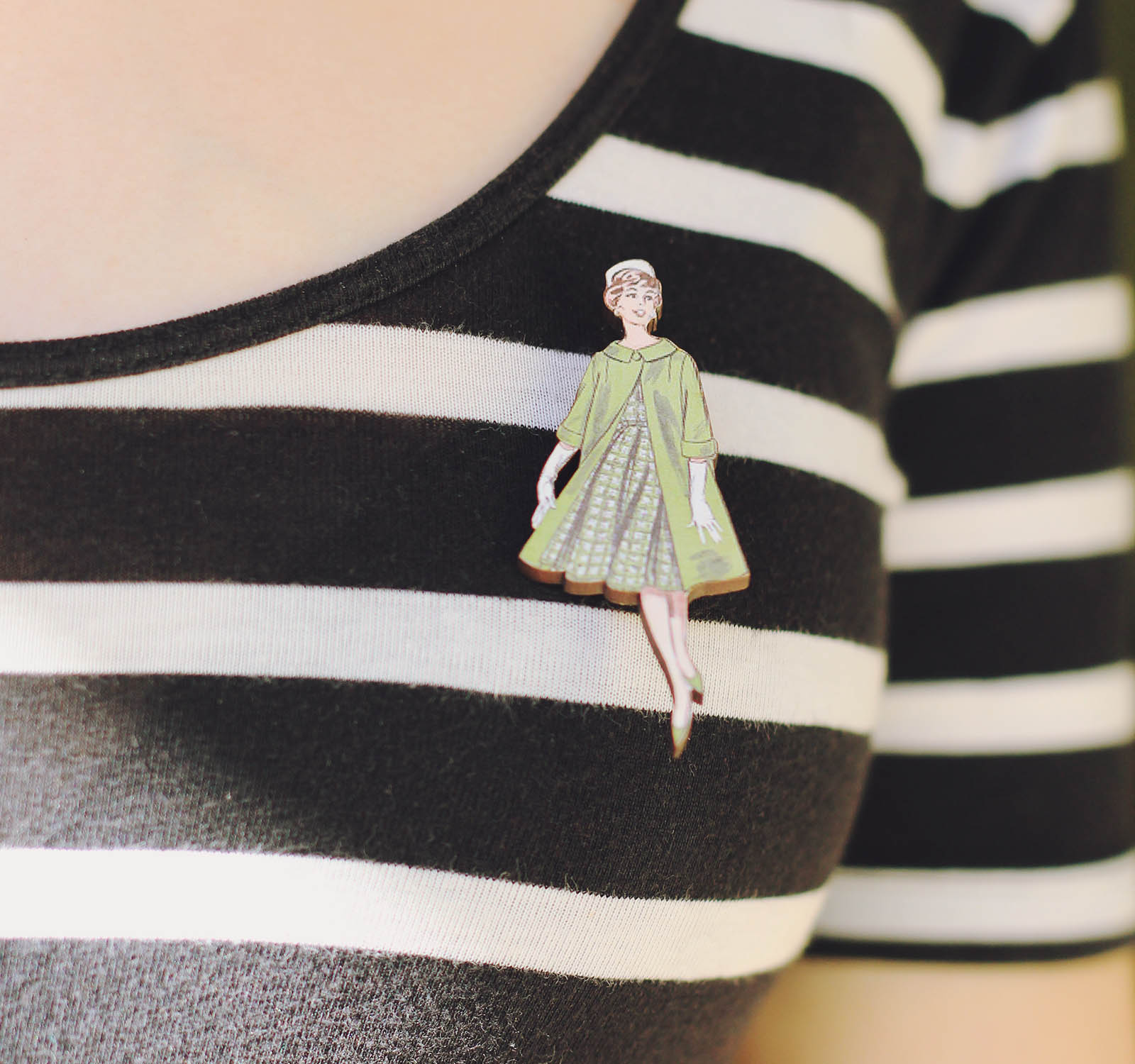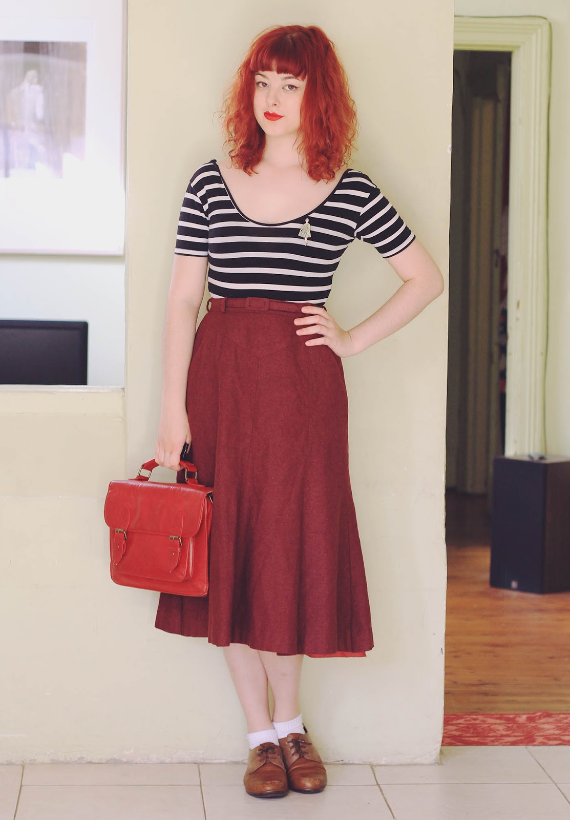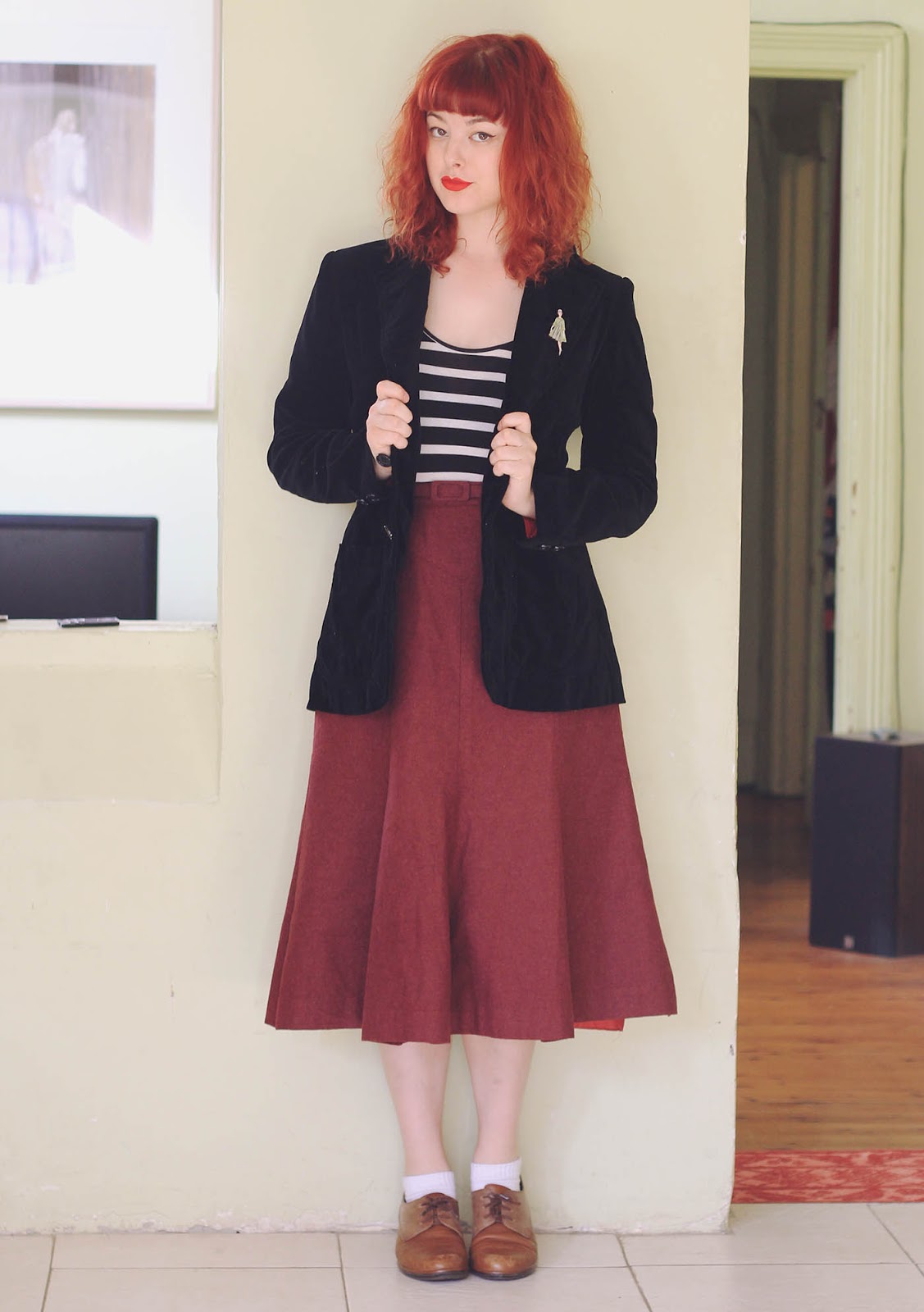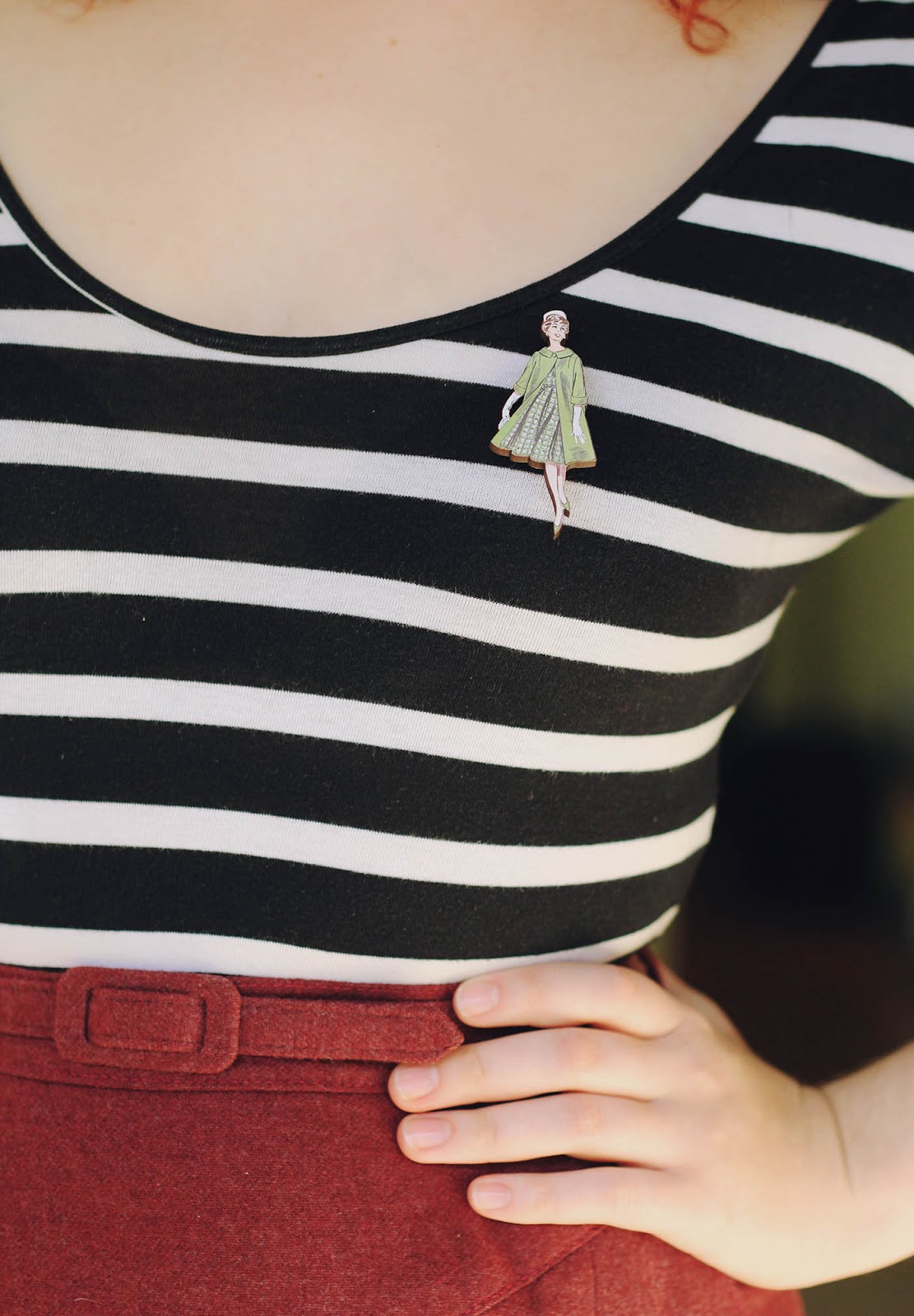 Lately I've found a number of wonderful woolen vintage skirts at the op shop, and it's made me realise that sizes were a lot smaller in the past - although I'm usually a size 8 or 10, when it comes to vintage skirts I'm always a size 12-14! To match my vintage outfit, I also wore this handmade brooch based on a vintage sewing pattern sent to me by Ladybird Likes - isn't it gorgeous?