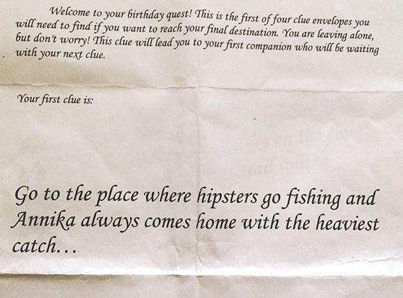 Because I was so excited (and anxious) about my surprise, I managed to only get 6 hours of sleep. At around 10:30am on the morning of my birthday, after staring at the clock and buzzing with nervous energy for about 4 hours straight, Luci handed me a cryptic envelope: Clue #1!