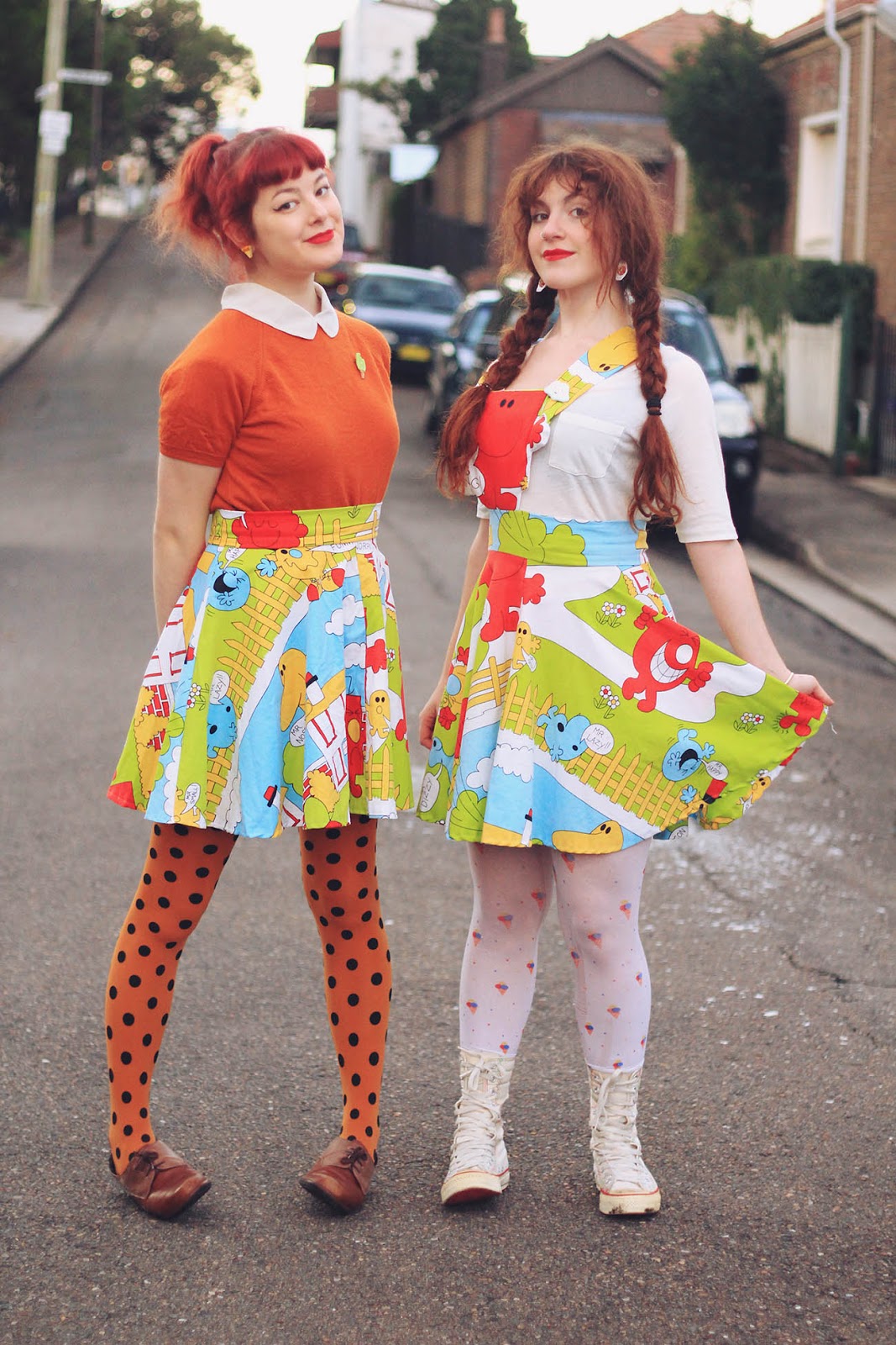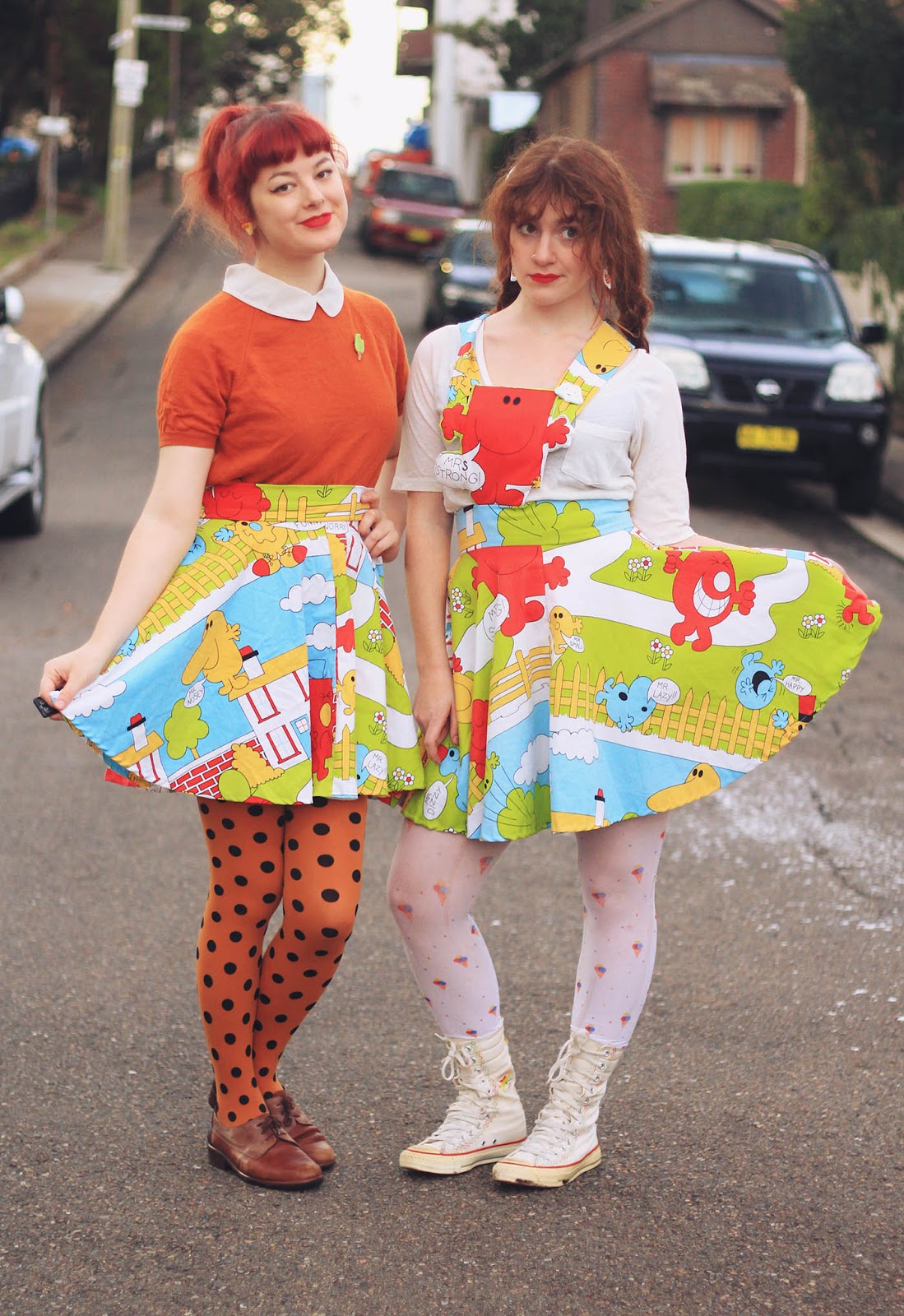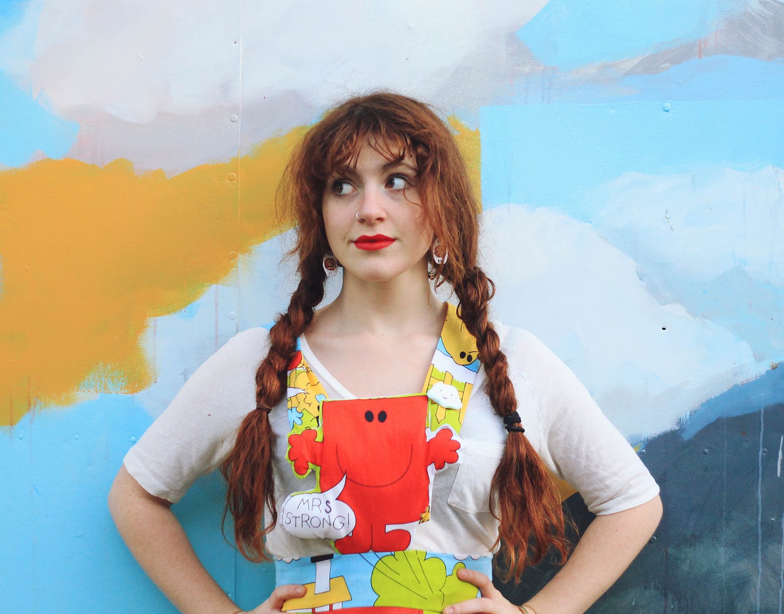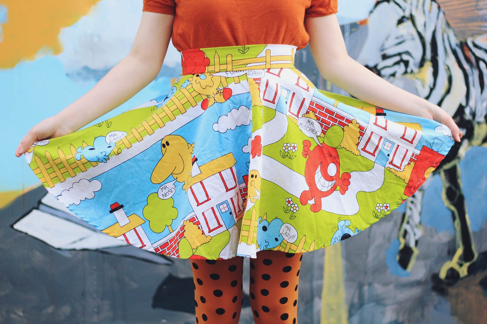 Last Friday I woke up determined to make something of these Mr Men bedsheets that I found at the op shop 3 or 4 months ago. I sent Katie a quick message asking if she wanted to join me in a crafting-session so we could make ourselves matching outfits for the Finders Keepers Craft Markets later that night. She responded with an enthusiastic yes, but unfortunately she started feeling really anxious and had to cancel. I felt terrible having my main girl feel so bad, and wanted to do anything that I could to help, so I spent the whole day binge-listening to podcasts and working on some skirts for us both. After making two matching circle skirts, I thought I would cut around one of the Mr Men characters and turn it into a pinafore-style dress - after transforming "Mr" Strong into "Mrs Strong" of course (that's what I think of your sexist gender-binaries, Roger Hargreaves! Did you know that the "Mr Men" and "Little Misses" live in "Misterland"? *grumpy face*). I also put some stuffing inside the pinafore-bit to help it keep its shape, and I'm so happy with how it turned out.