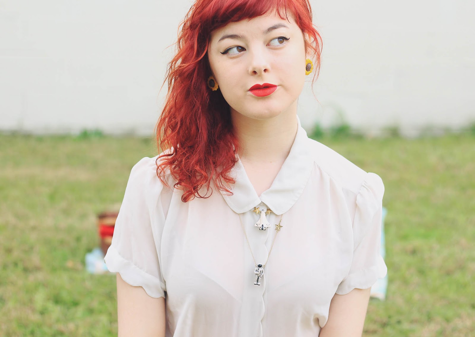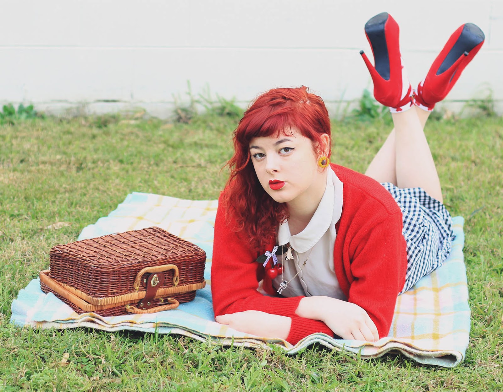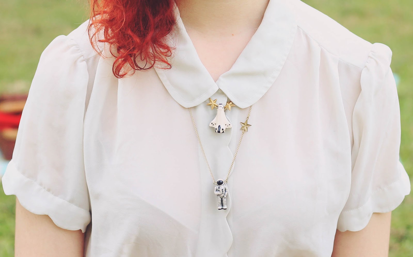Blouse, skirt, cardigan and basket are thrifted | space shuttle necklace c/o Eclectic Eccentricity | astronaut necklace c/o Ginger Pickle | shoes were c/o Sammy Dress (years old) | socks from markets | cherries c/o Sarsparilly (actually a hairclip) | earrings are handmade by me