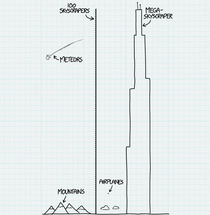The illustration above (by XKCD's What If) shows a skyscraper that's only 10,000 floors high. Still much smaller than a billion! Click here to see what a billion-story building would look like!