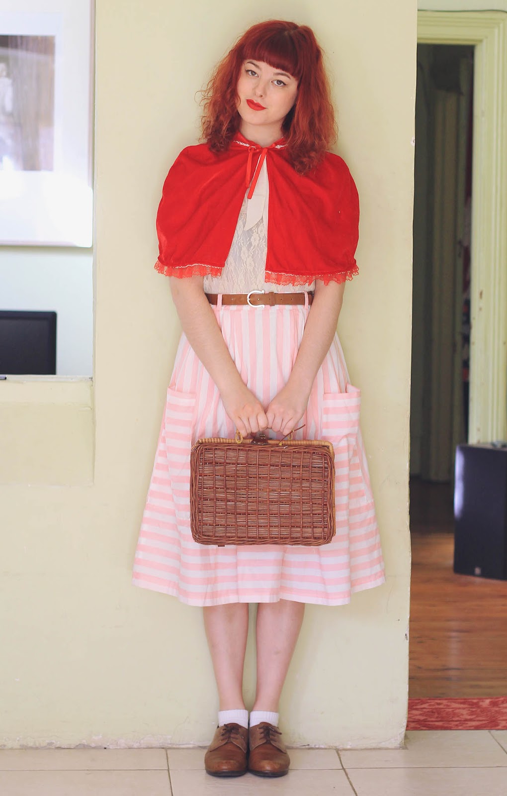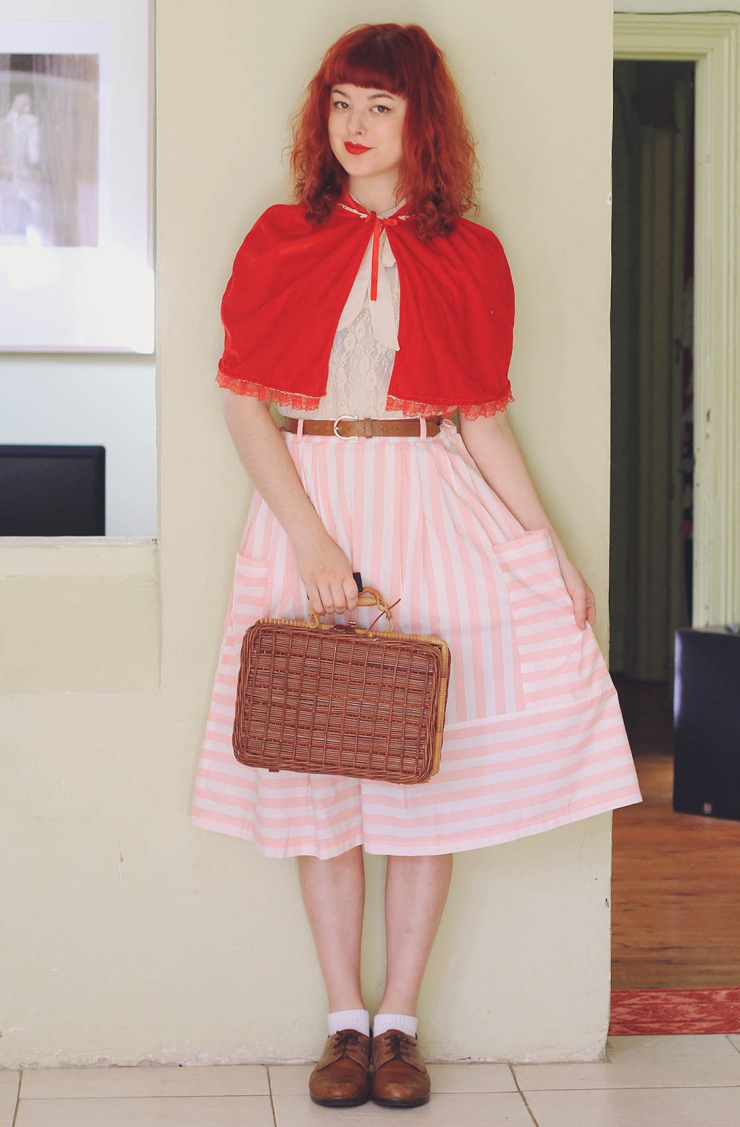 Cape, skirt, basket and belt are thrifted | shoes are Naot | blouse is from Forever 21 (several years old)